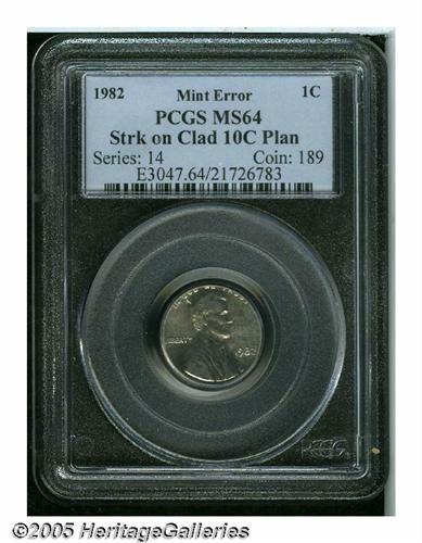 <B>1982<1C> Large Date Lincoln Cent--Struck on a Clad Dime Planchet--MS64 PCGS.</B></I> Collectors often wonder whether their 1982 Cents are struck on a brass or a plated zinc planchet. For the present piece, the correct answer is neither, since the Cent was instead struck on a Dime planchet. Softly struck on portions of the Memorial and portrait. Potent luster sweeps across the unabraded and lightly toned surfaces.<BR><I>From The Larry Rausch Collection of Errors, Part Four.</B></I>