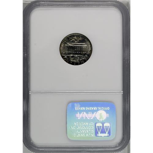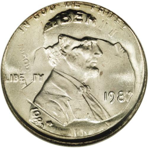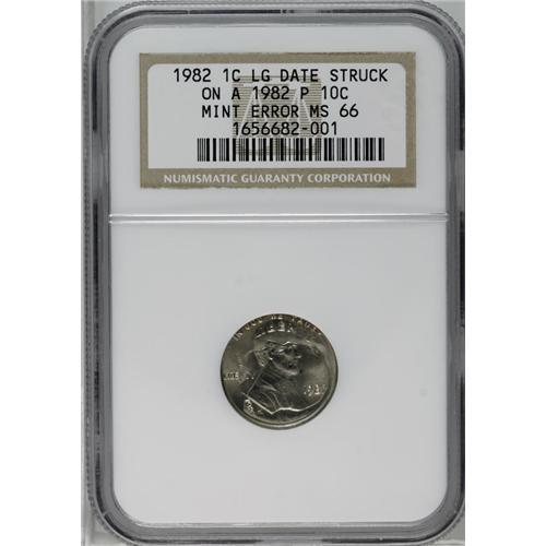 <B>1982<1C> Lincoln Cent--Struck on a Roosevelt Dime--MS66 NGC.</B></I> A rare 11-cent piece, consisting of a Lincoln cent struck over an already struck Roosevelt dime of the same date. This is an impressive Gem quality example with highly lustrous light gray surfaces accented by a trace of gold toning along the reverse border. Obverse on obverse orientation with 90 degrees rotation between the design; the date from the Roosevelt dime is visible at the back of Lincoln's shoulder.