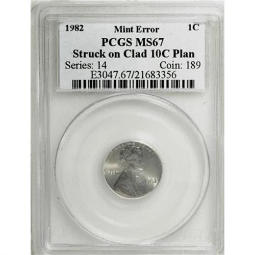 <B>1982 1C Lincoln Cent--Struck on Clad 10C Planchet--MS67 PCGS.</B></I> PCGS Population (316/24). NGC Census: (0/0). (#3047)<BR><BR><B>Coin Engraver:</B> Victor D. Brenner<BR><BR><b>Shipping:</b> Coins & Currency (<a target="_blank" href="http://www.heritageauctions.com/common/shipping.php">view shipping information</a>)