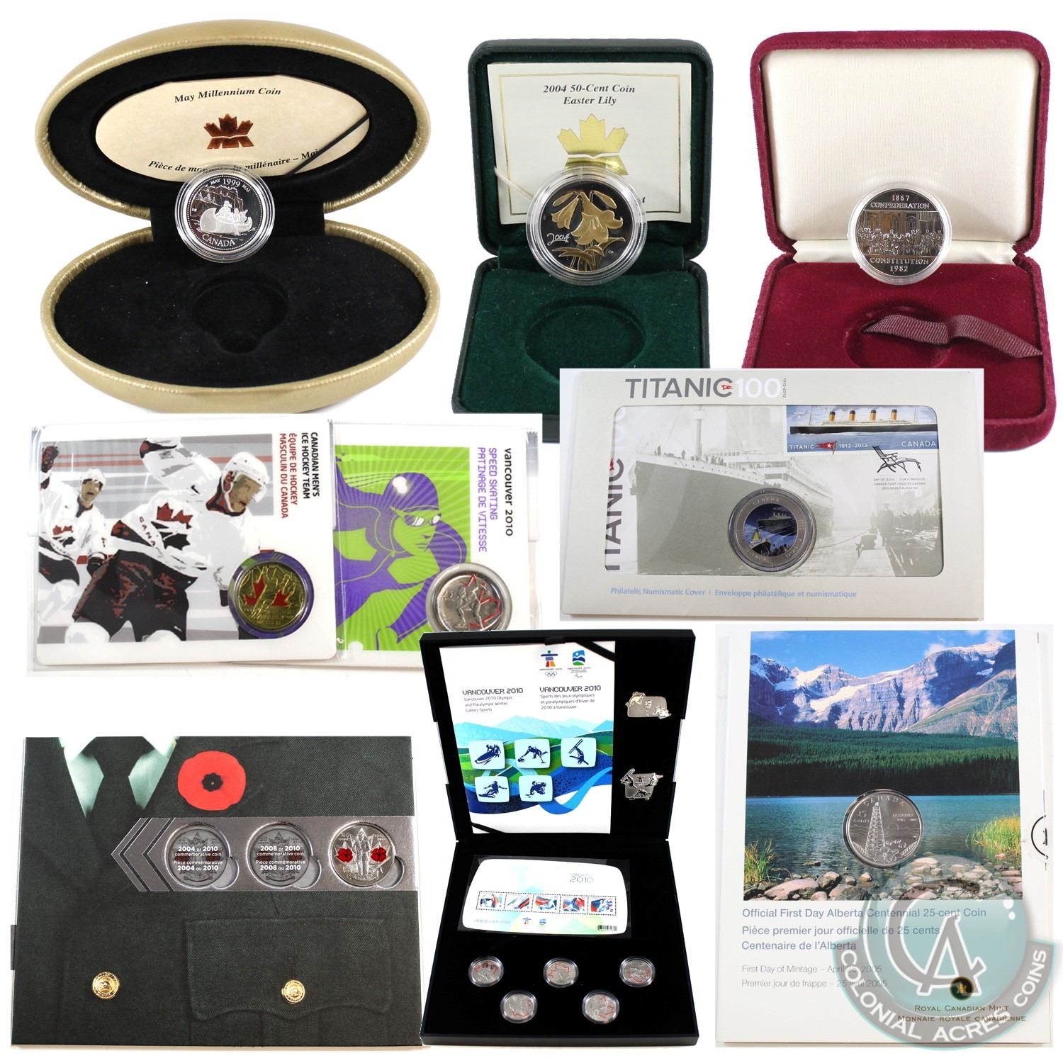 1982-2010 Canada RCM Collection. You will receive 1982 Constitution Dollar, 1999 Proof Millennium 25-cent-May, 2004 Easter Lily 50-cent (missing outer sleeve), 2005 Alberta First Day Cover, 2009 Petro Canada Men's Hockey 25-cent, 2009 Petro Canada Speed Skating 25-cent, 2012 Canada Post Titanic 25-cent First Day Cover Coin & Stamp Set, 2010 Remembrance Day Collector Card with 2010 Poppy 25-cent & 2010 Vancouver Olympic Silver Collector Set (missing outer sleeve). 9 pcs