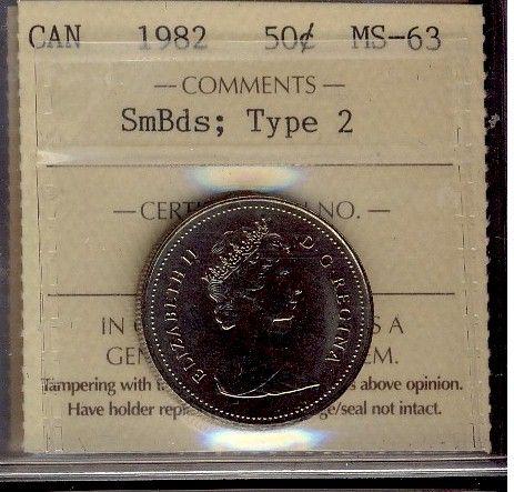 1982 50¢ SmBds Type 2 ICCS MS63. Lot of 2 coins.