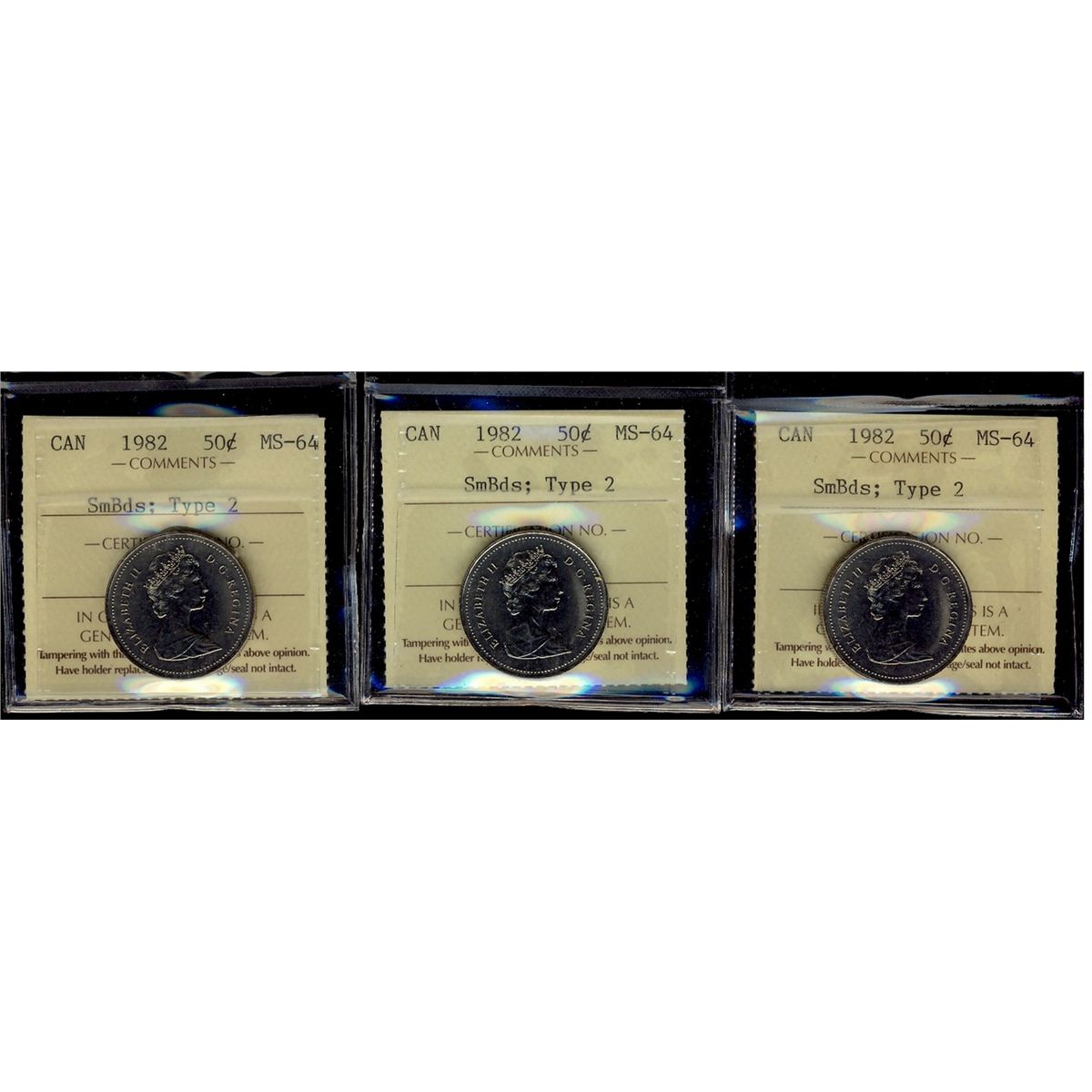 1982 50¢ SmBds Type 2 ICCS MS64. Lot of 3 coins.