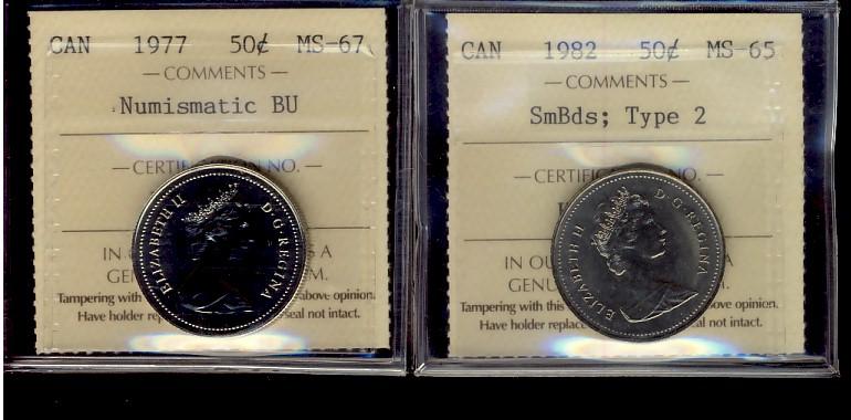1982 50¢ SmBds Type 2 MS65 & 1977 MS67 NBU. Lot of 2 coins both ICCS graded.