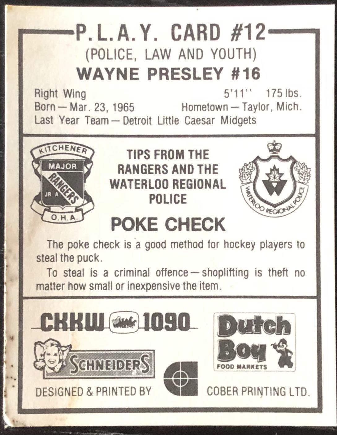 Team set issued by Waterloo (ON) Reginal Police, card #12 CHL, OHL, vintage, rookie
