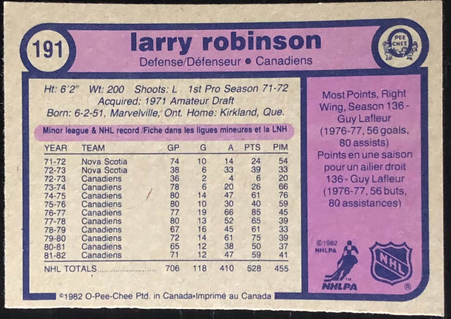 Card #191 NHL, hockey, vintage, OPC, hall of fame