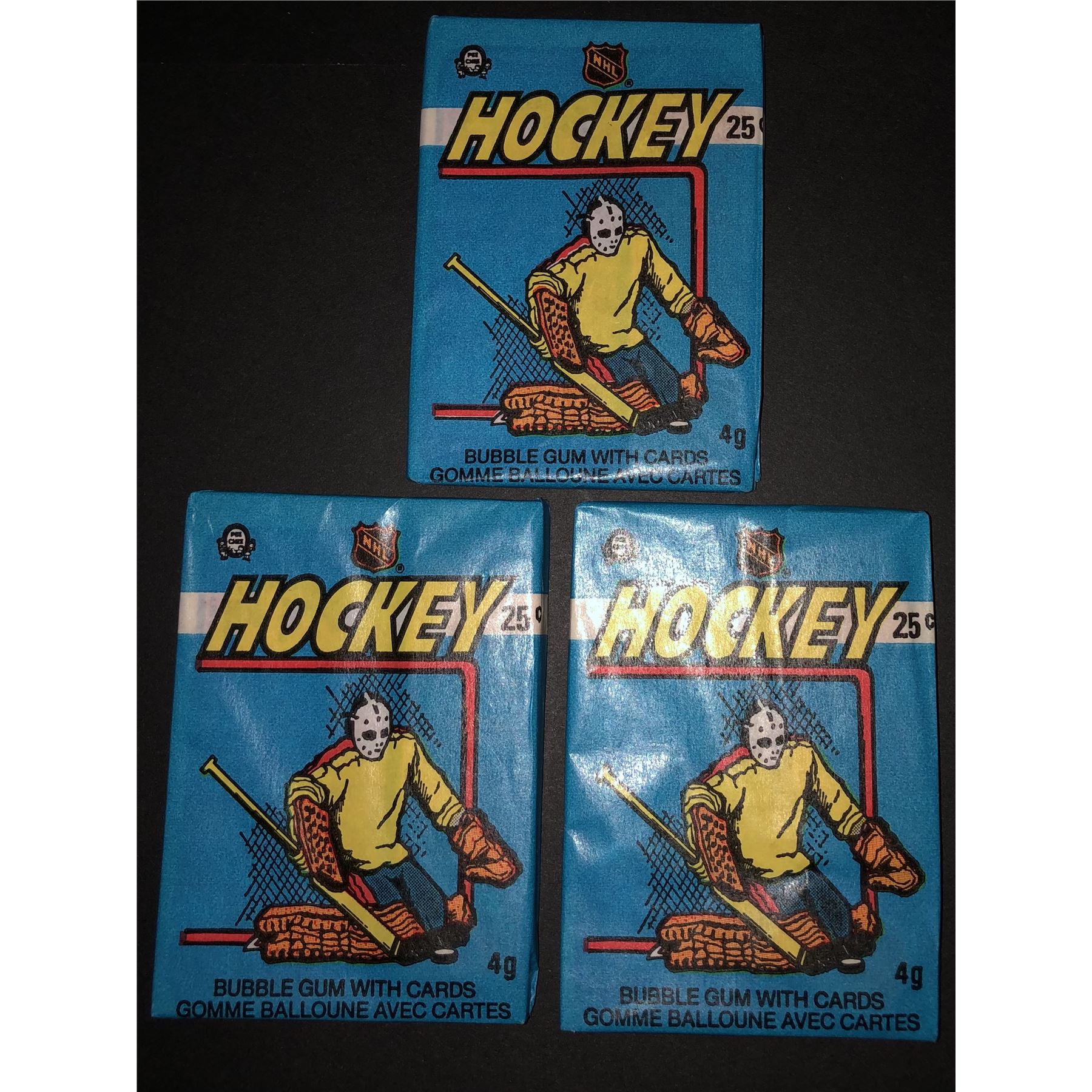1982-83 O-PEE-CHEE hockey wax packs (3). Monster set includes key rookie cards of hall of famers Grant Fuhr, Dale Hawerchuk, Ron Francis & Joe Mullen.