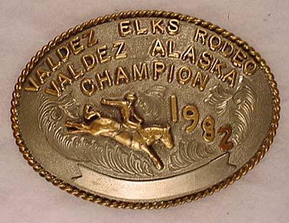 1982 ALASKA VALDEZ ELKS RODEO CHAMPION BELT BUCKLE - Embossed on the back, JC