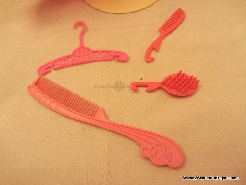 includes her hand comb & brush, 1 large styling comb and a fashion hanger. NOTE: In good