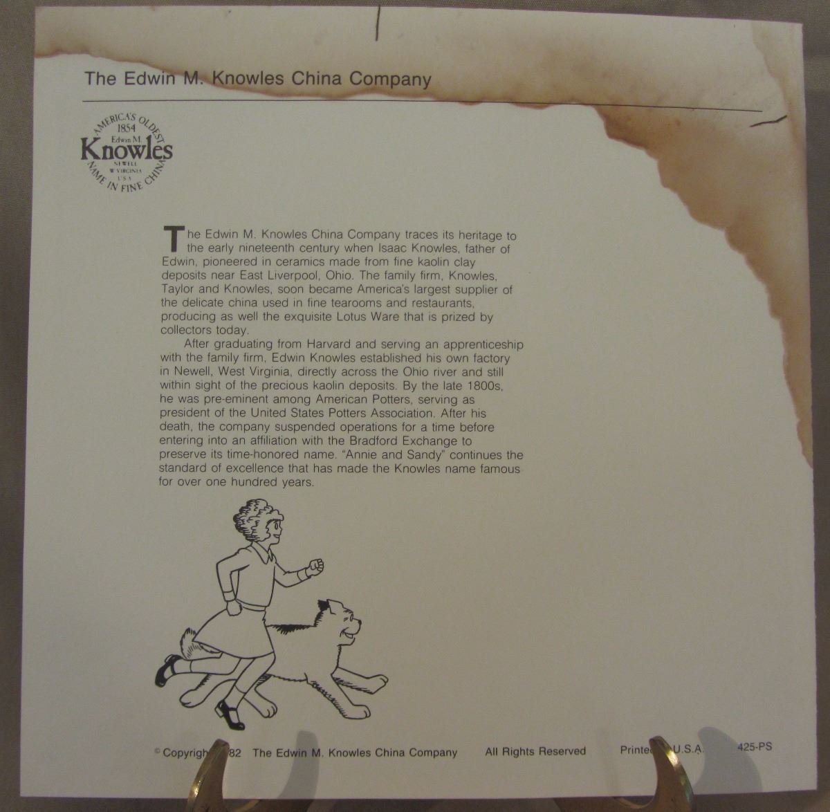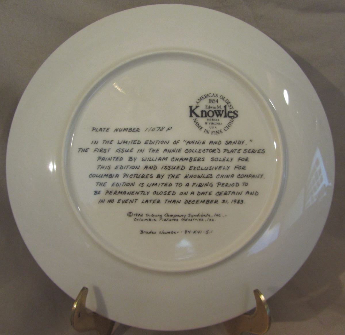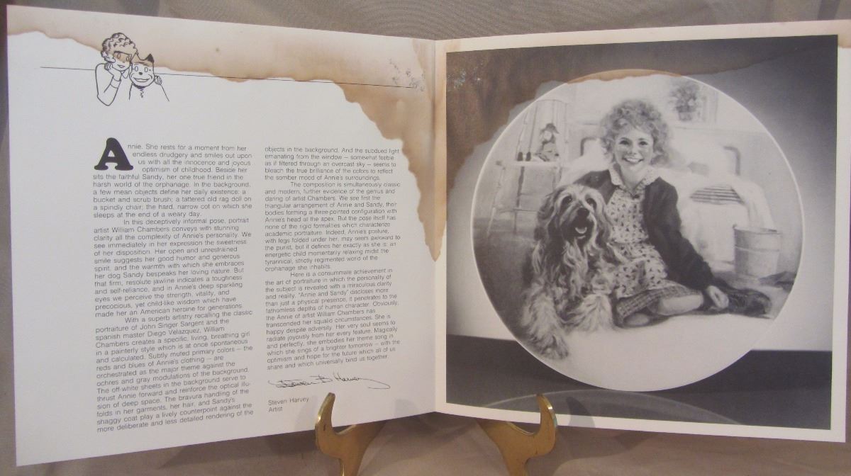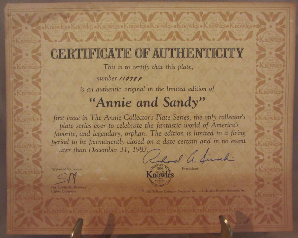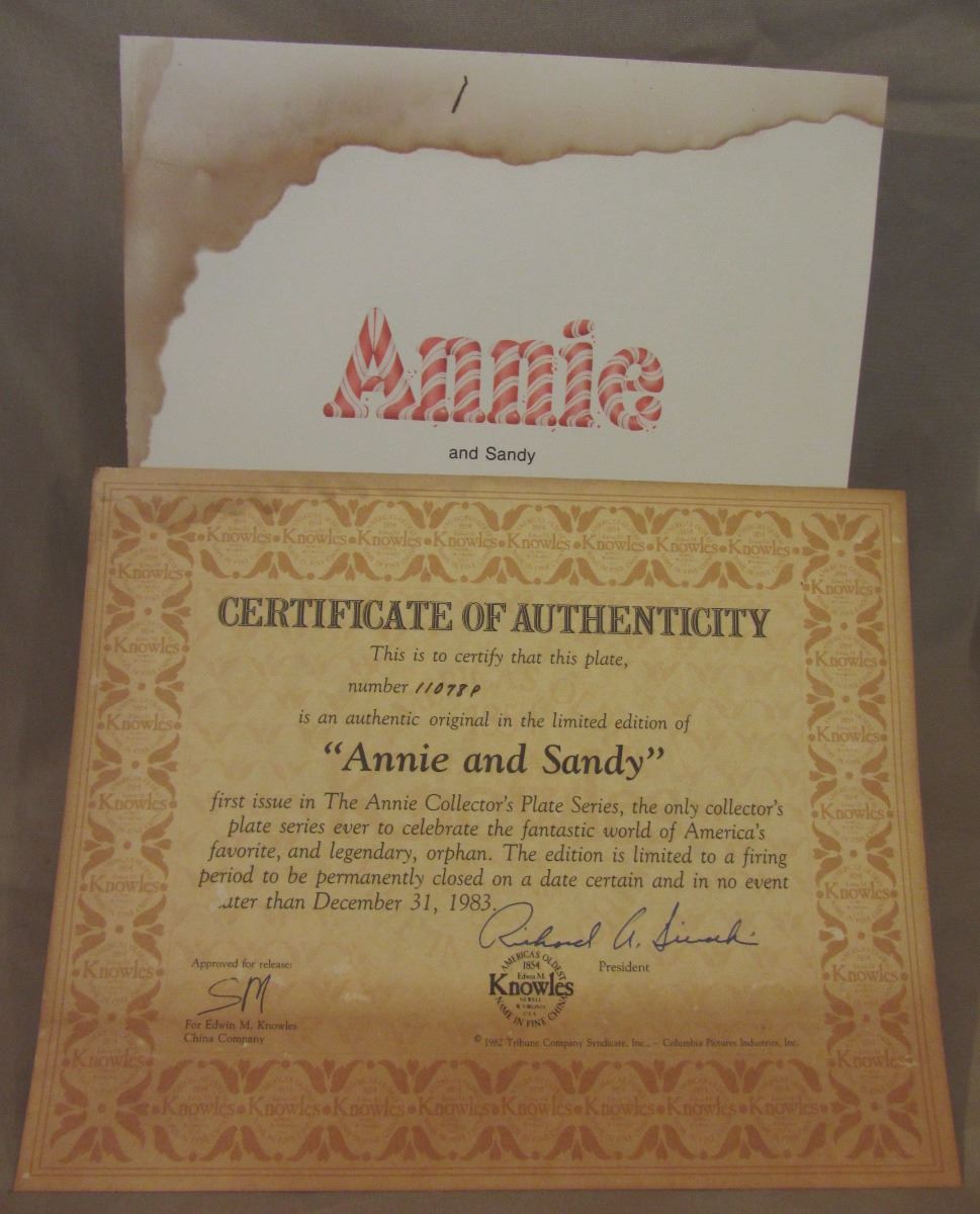 8 1/2" plate, dated 1982 'Annie and Sandy' this plate is the first issue in 'The Annie Collector's Plate Series'. The plate number is 11078 P, Bradex Number: 84-K41-5.1 and made available by Edwin M. Knowles Co. It comes in the original box, with paperwork and COA. (Please see images for details)