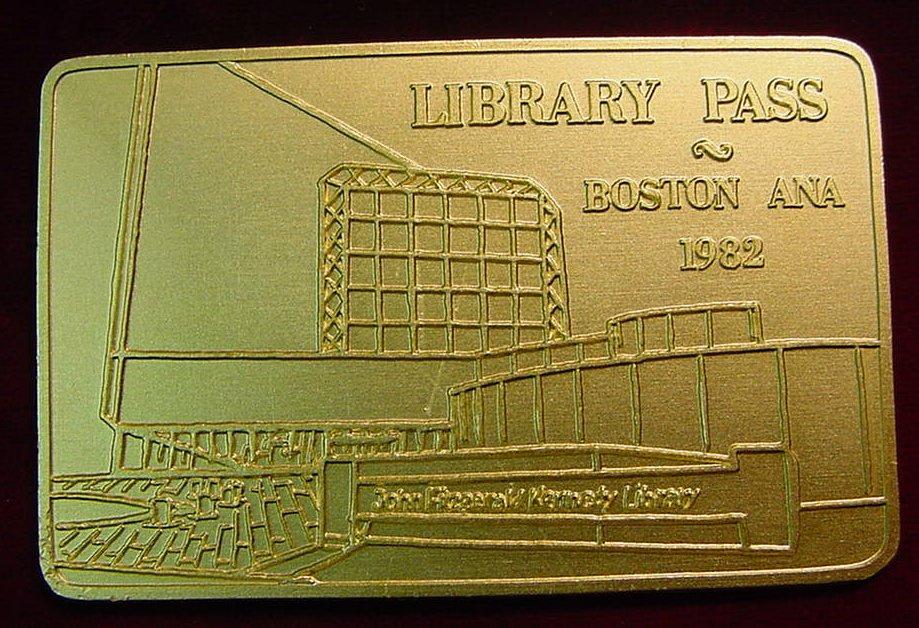 1982 Boston ANA Library Pass. Gold Colored Rectangle Aluminum.