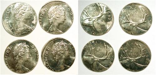 4 pieces, 1982 25 cents struck on 10 cent planchets.