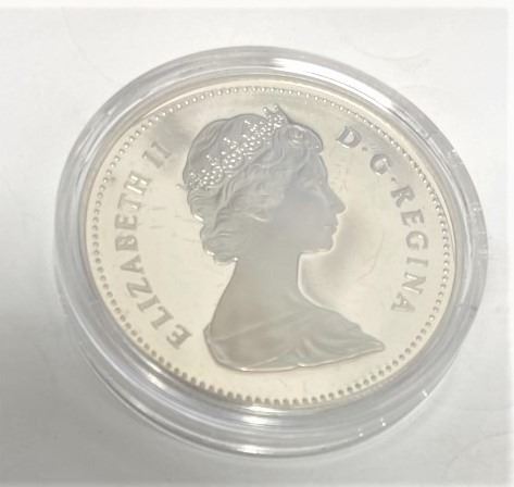 Designed by Huntley Brown, the coin reverse depicts a bison skull and the Saskatchewan Legislative Building with dates 1882 and 1982 on either side.