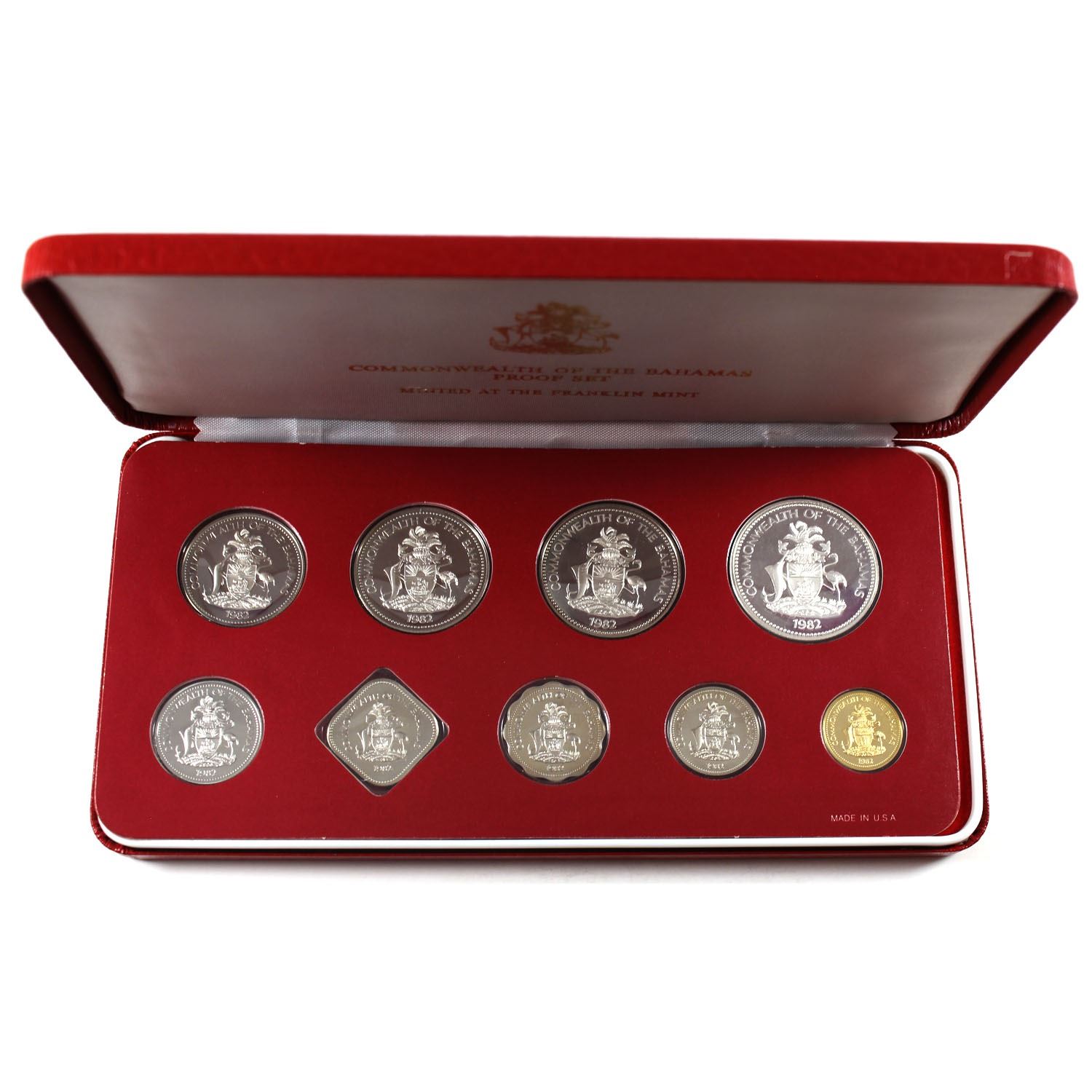 1982 Commonwealth of the Bahamas 9-coin Proof Set Minted by the Franklin Mint in Original Case with COAs. The $5 coin is .500 Silver.