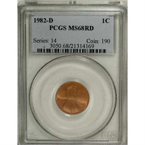 <B>1982-D 1C MS68 Red PCGS.</B></I> Square Base 2. A pristine orange-gold Superb Gem. Only STATES lacks a crisp impression. Presumably copper alloy, since no bubbles are visible beneath the fields.<BR><BR><B>Coin Engraver:</B> Victor D. Brenner<BR><BR><b>Shipping:</b> Coins & Currency (<a target="_blank" href="http://www.heritageauctions.com/common/shipping.php">view shipping information</a>)