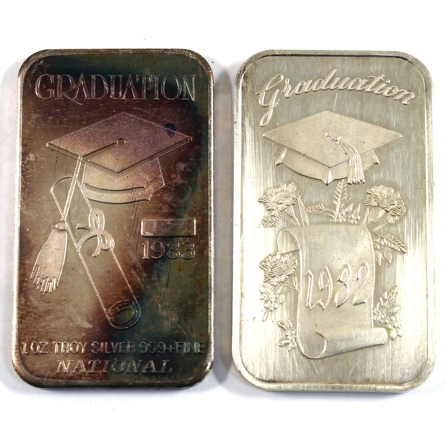 1982 Dahlonega Mint & 1983 National Mint 1oz Graduation Fine Silver Art Bars (TAX Exempt). 2pcs.