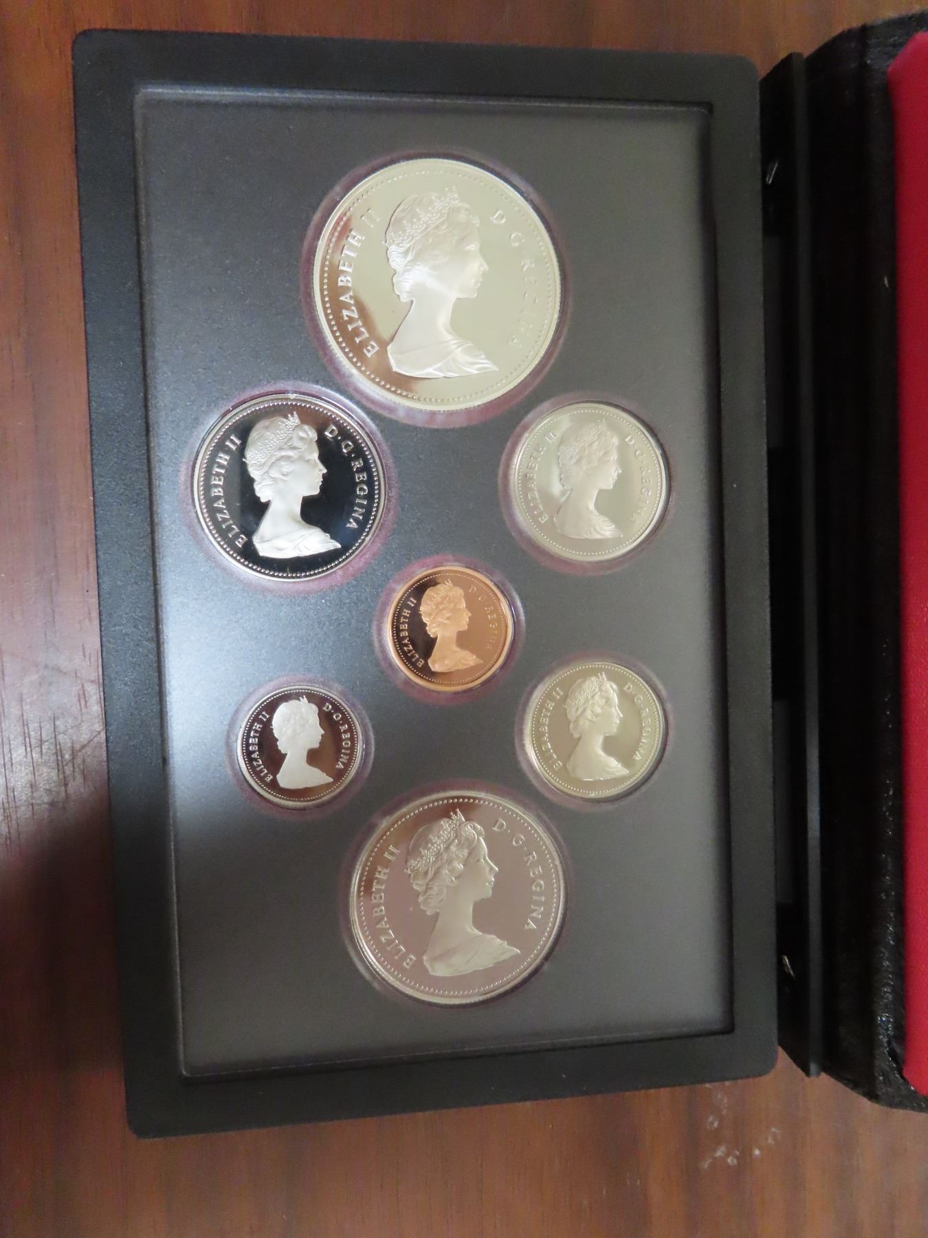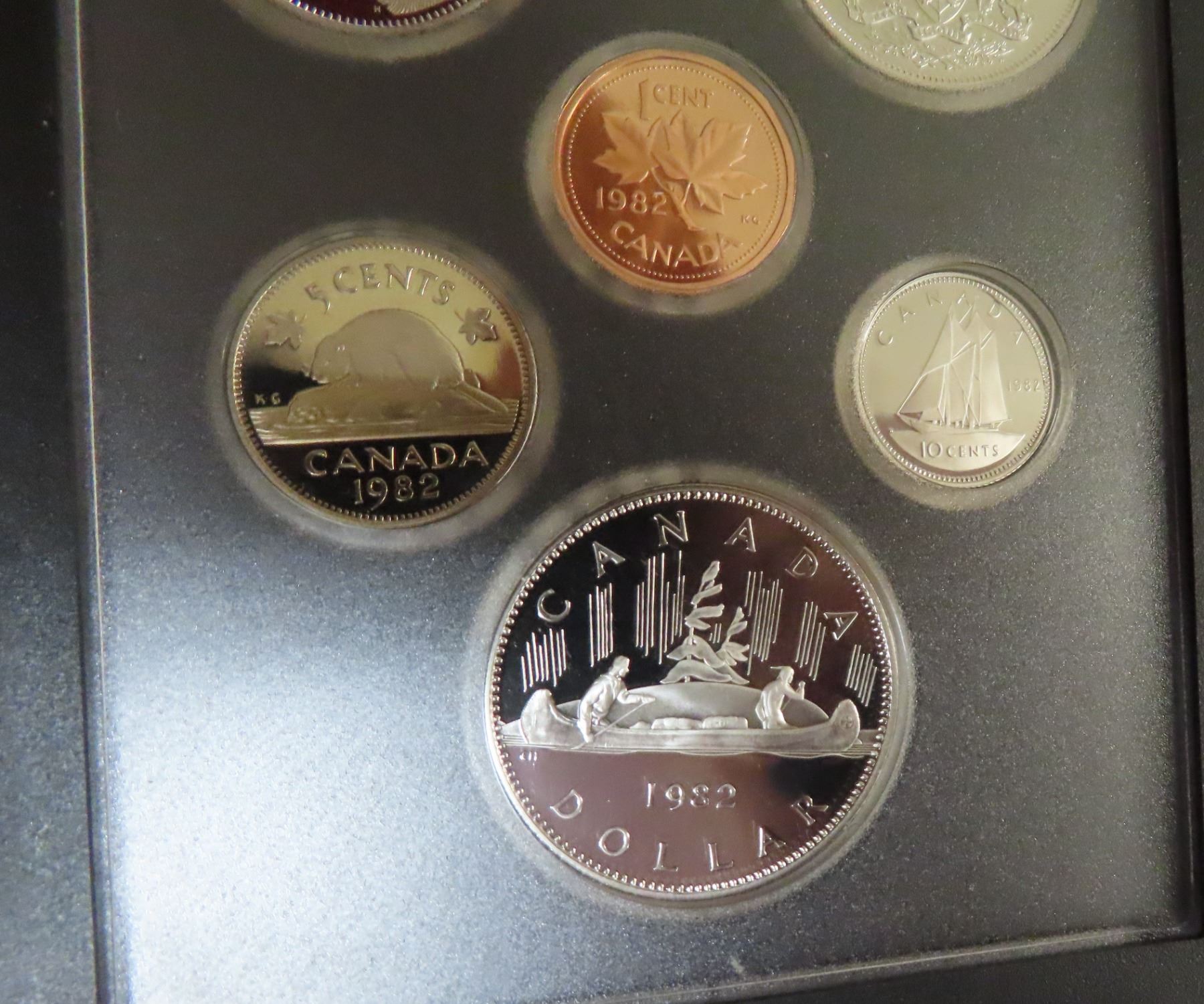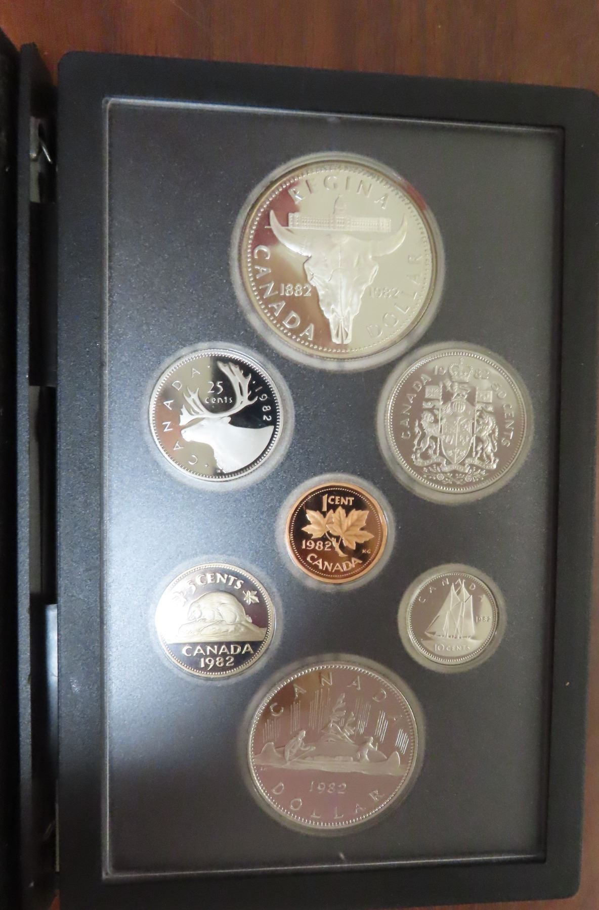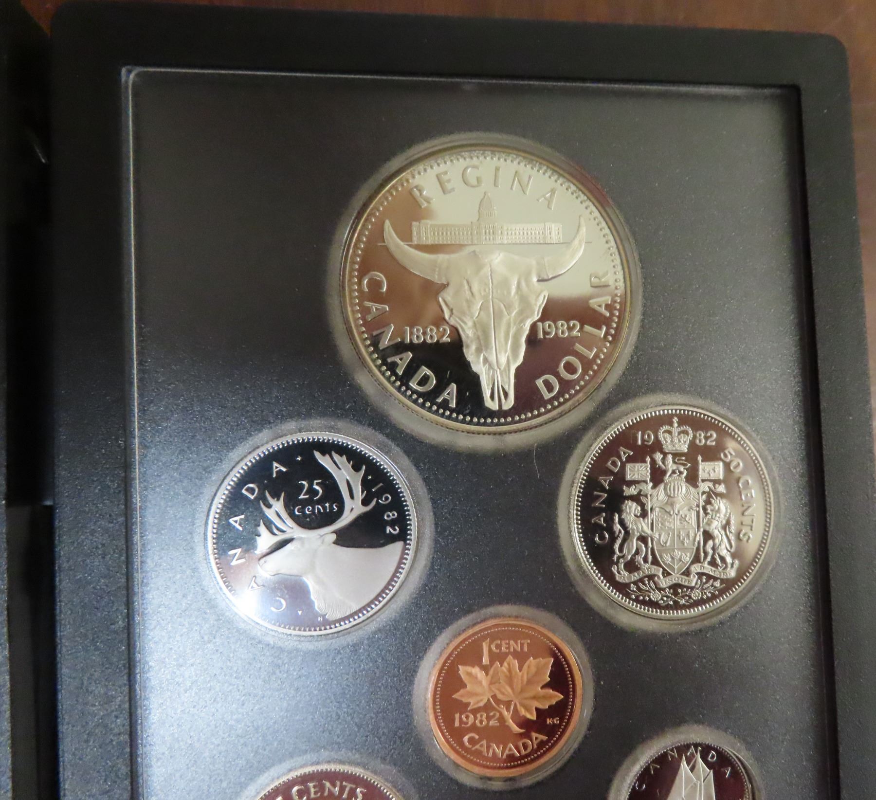 1982 Double Dollar Proof Set. The Silver Dollar commemorates the Centennial of Regina. Popular bison skull. All coins have Ultra Heavy Cameos. Includes Certificate of Authenticity. Bright White. Housed in its original Royal Canadian Mint case of issue.