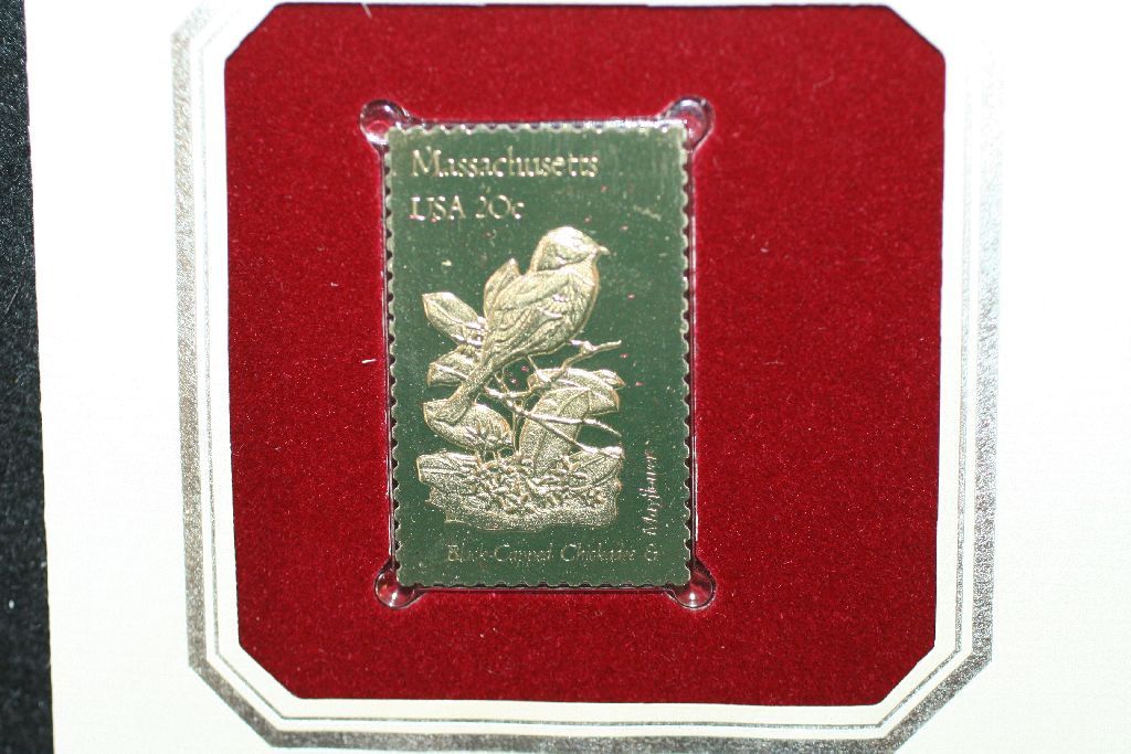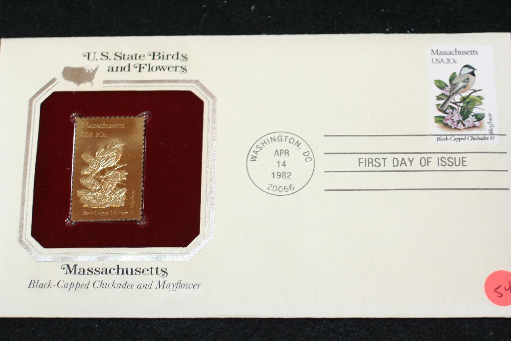 1982 First Day Issue 22K Gold Replica Stamp W/Postal Stamp; US State Birds and Flowers; Massachusetts Black-Capped Chickadee and Mayflower