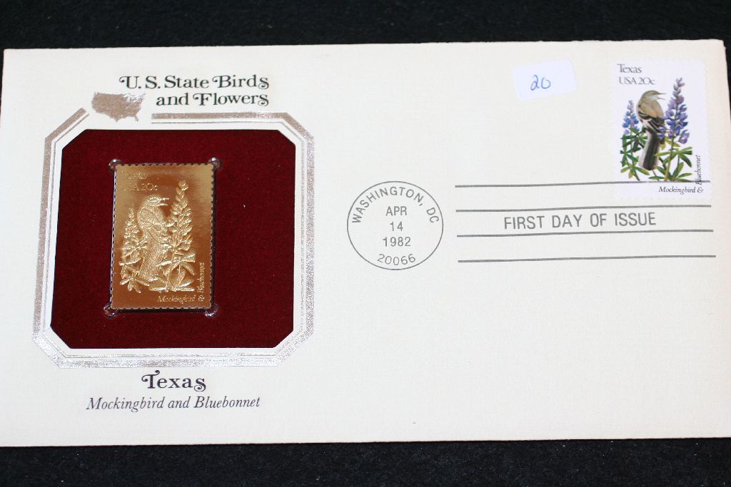 1982 First Day Issue 22K Gold Replica Stamp W/Postal Stamp; US State Birds and Flowers-Texas Mockingbird and Bluebonnet