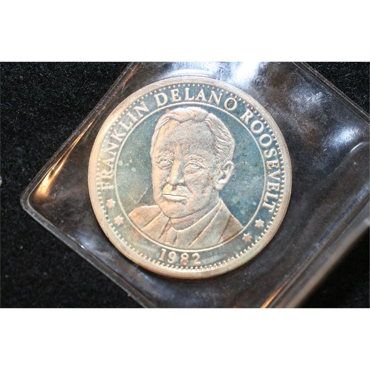 1982 First Day Issue Stamp Commonwealth of Dominica w/Commerative Silver Medal Celebrating 100th Anniv. Of Birth of FDR, .999 Fine 1 Oz.