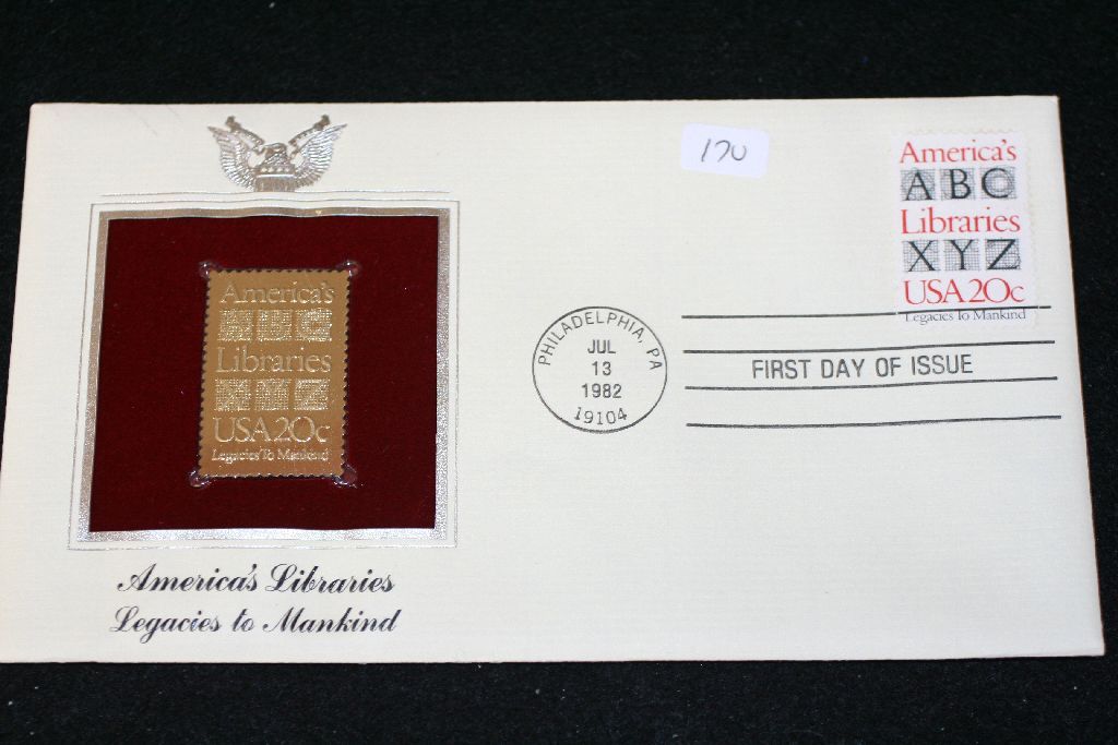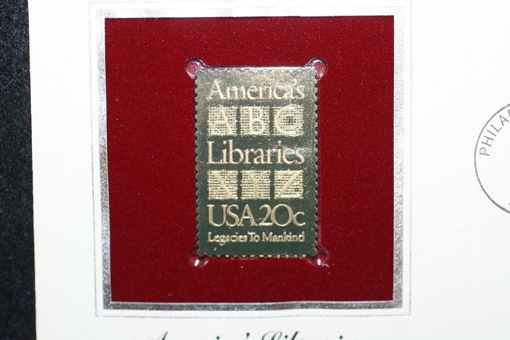 1982 First Day of Issue 22K Gold Replica Stamp W/Postal Stamp; America's Libraries Legacies to Mankind