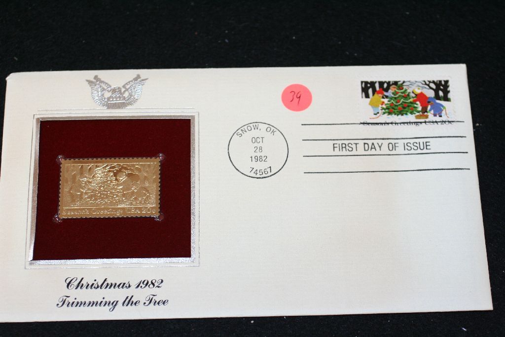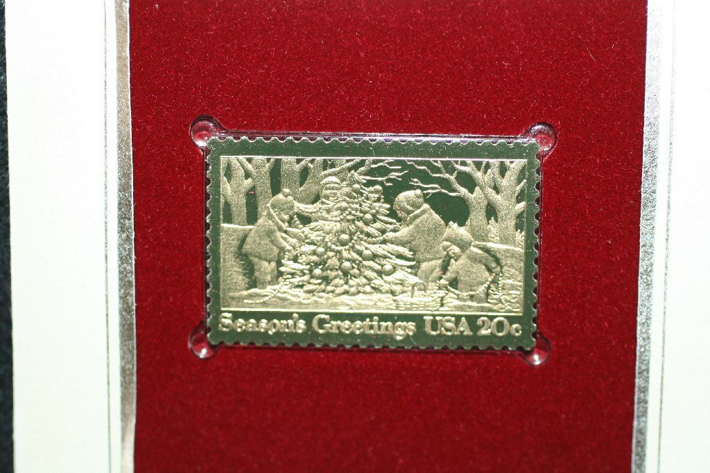1982 First Day of Issue 22K Gold Replica Stamp W/Postal Stamp; Christmas 1982 Trimming The Tree