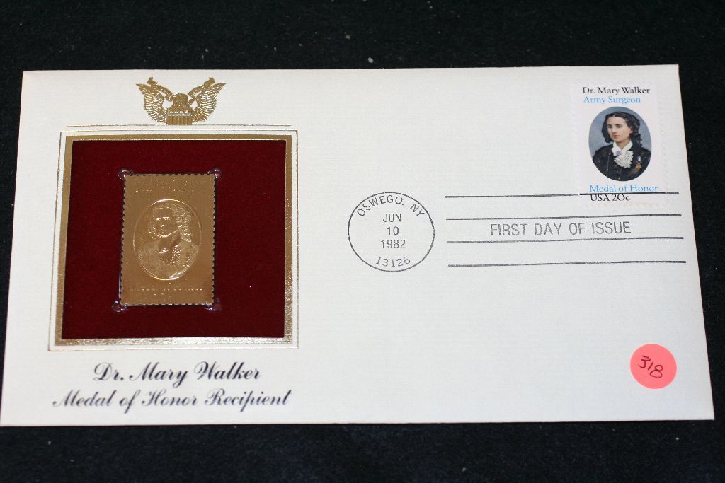 1982 First Day of Issue 22K Gold Replica Stamp W/Postal Stamp; Dr. Mary Walker Medal of Honor Recipient
