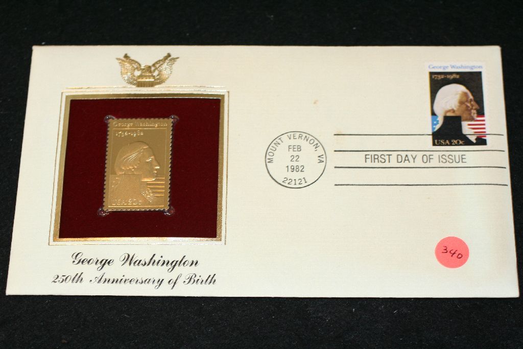 1982 First Day of Issue 22K Gold Replica Stamp W/Postal Stamp; George Washington 250th Anniversary of Birth
