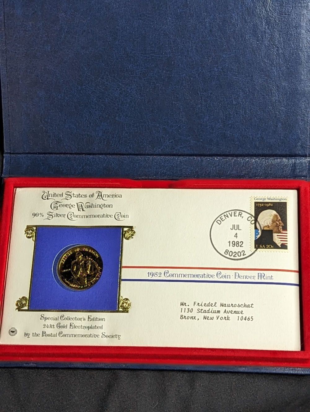 A 1982 George Washington Commemorative Silver Half Dollar, First day of Issue Cover in 24K Gold plating Very Cool!