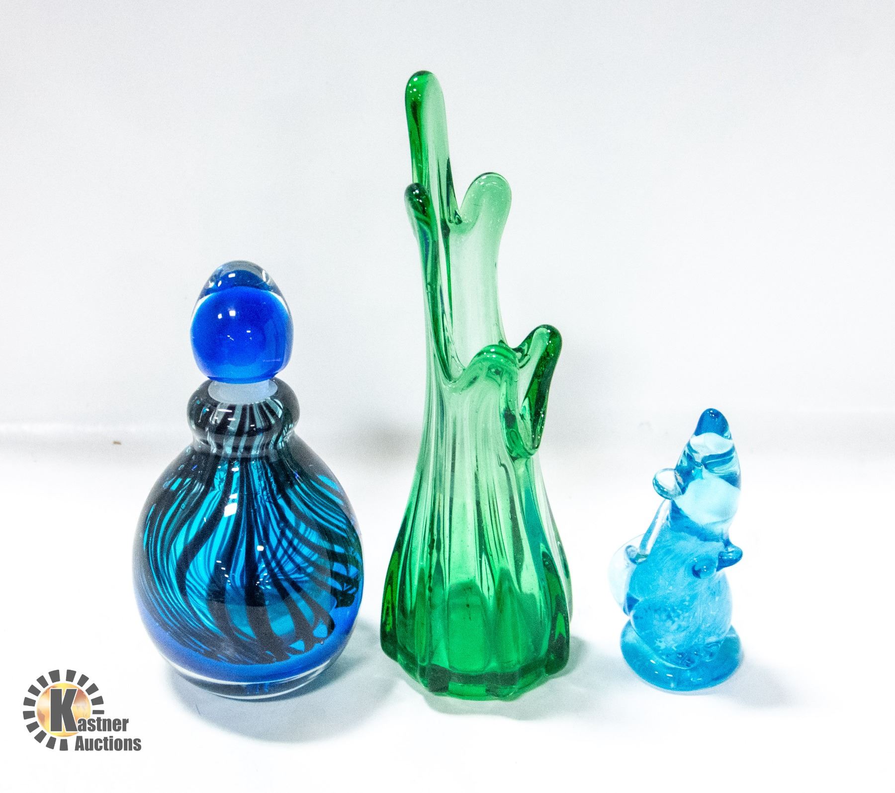GREEN ART GLASS DRIPPING STYLE VASE 8 INCHES TALL + ART GLASS BLUE LIDDED PERFUME/ESSENTIAL OIL BOTTLE NEW 6 INCHES TALL **ALL ITEMS MUST BE REMOVED BY 5PM SATURDAY, FEBRUARY 22ND 2025. ALL REMAINING ITEMS WILL BE SUBJECT TO A $6.00 PER DAY STORAGE CHARGE. ANY ITEMS REMAINING AFTER MONDAY, MARCH 10TH 2025 WILL BE CONSIDERED FORFEITED. NO REFUNDS WILL BE ISSUED FOR FORFEITED ITEMS. TO SCHEDULE A PICK UP APPOINTMENT CLICK HERE
