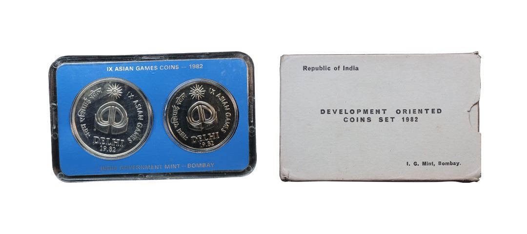 1982, IX Asian Games, UNC set of 2 coins, 100 rupees and 10 rupees, Bombay mint, RB 94, in original mint packing.