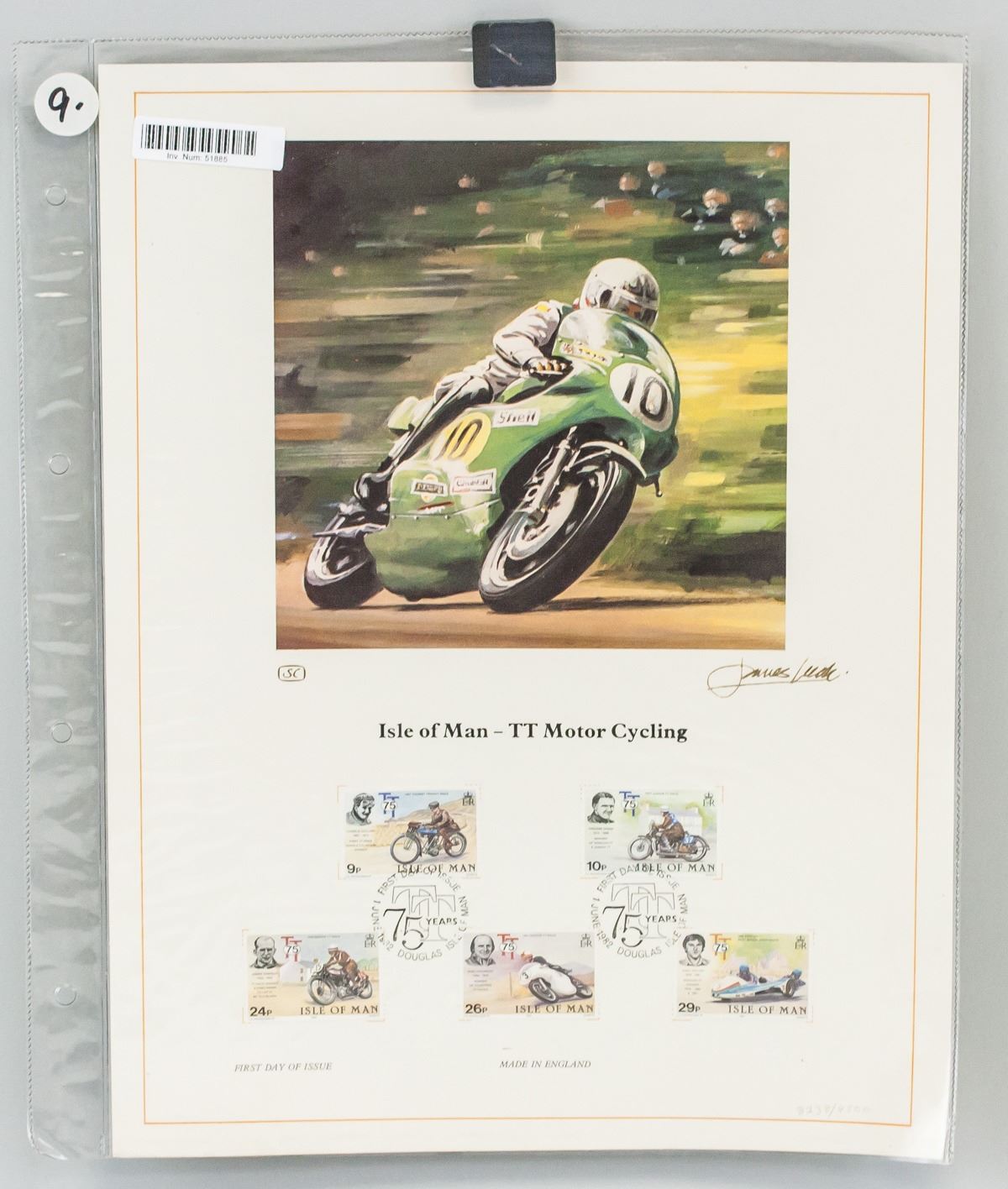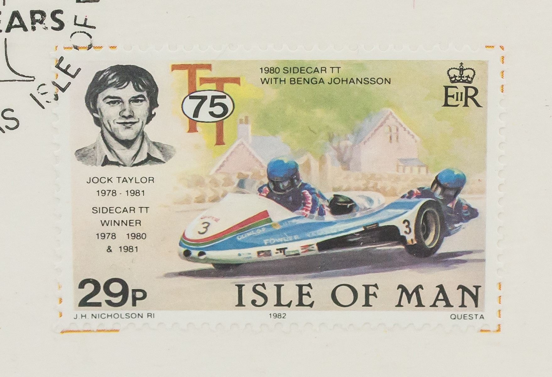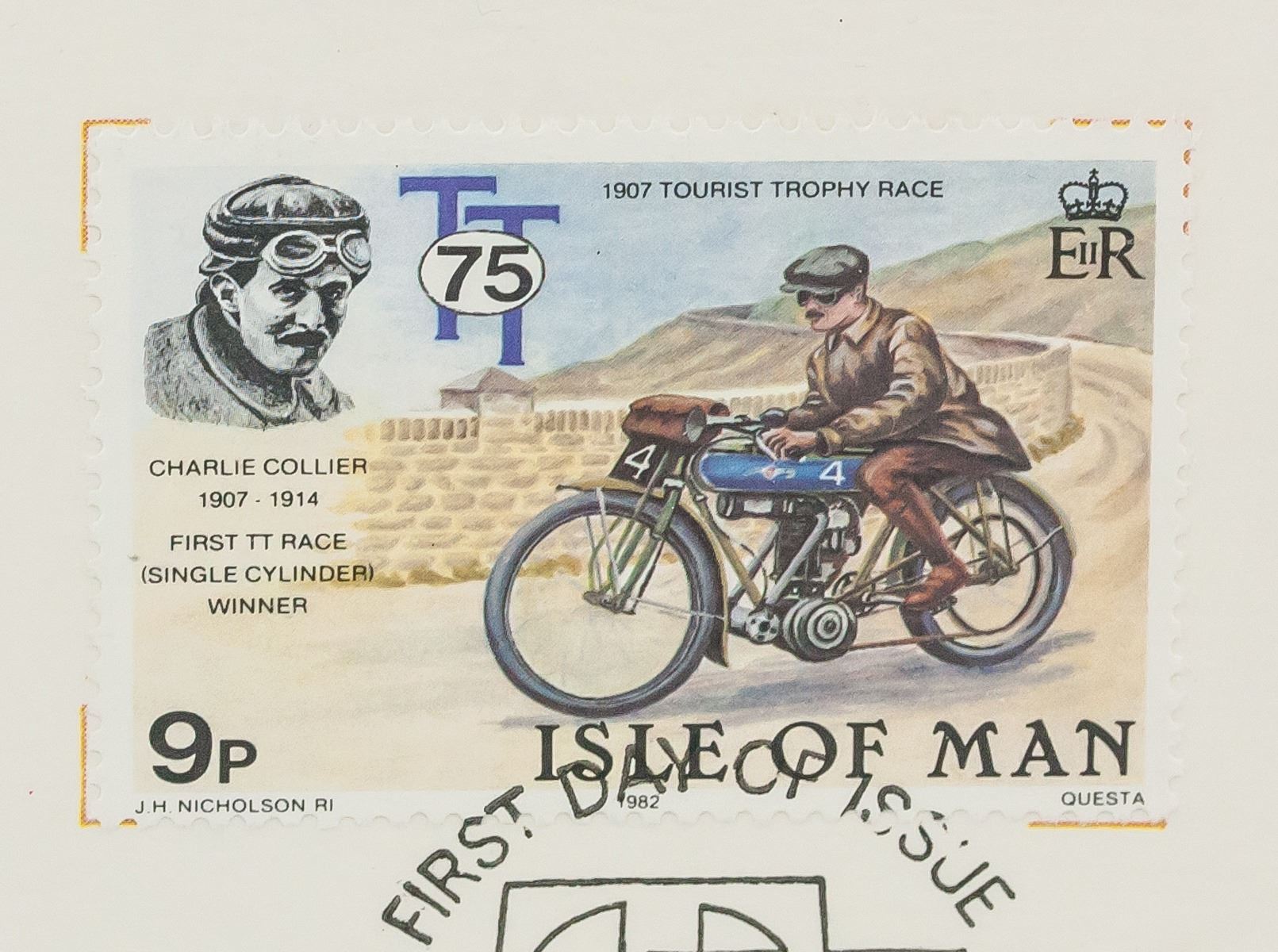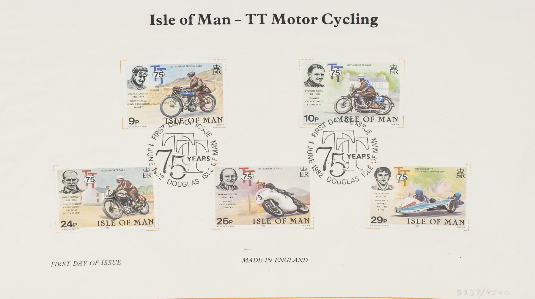 Five (5) assorted Isle of Man First day of issue stamps. Of various face value. Dated 1982. 33 x 25.5 cm, stamp size: 2.7 x 4 cm