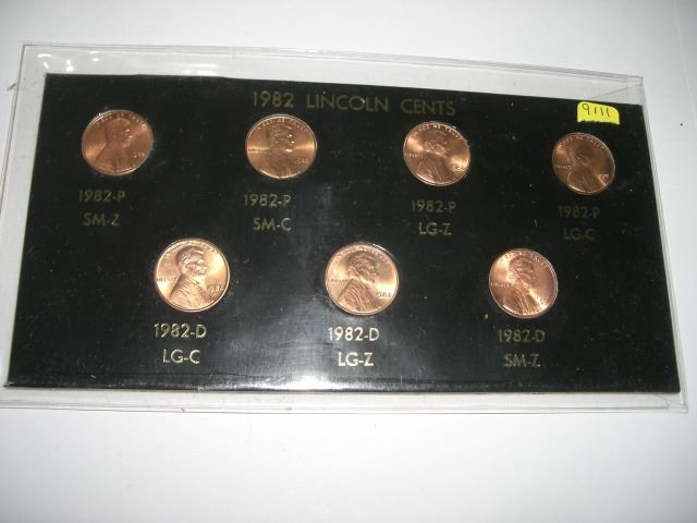 1982 LINCOLN PENNY CENT SET OF 7 COINS INCLUDING 82P SM-Z, 82P SM-C, 82P LG-Z, 82P LG-C, 82D LG-C, 82D LG-Z & 82D SM-Z!! COIN SET CAME OUT OF SAFE!! ***Coin, Currency & All Items Listed in this auction - Grades, Conditions and Values are not Safe Deposit Coins LLC Responsibilty. Grades, Condition and Values are determined by Consigner(s) & Buyers ONLY