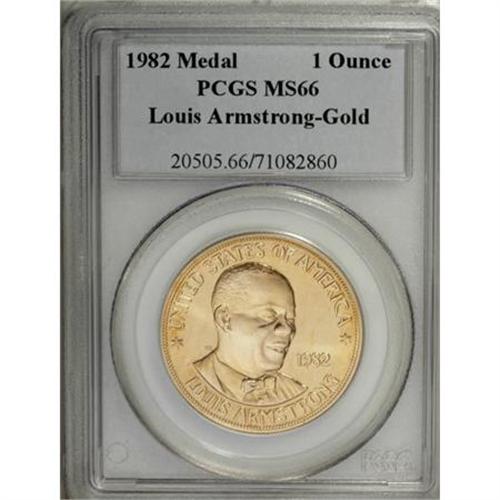 <B>1982 Louis Armstrong One Ounce Gold Medal MS66 PCGS.</B></I> The American Arts Commemorative Series was a precursor to the American Gold Eagle program, an early attempt to take gold market share away from the apartheid-associated Krugerrand. Jazz trumpeter Louis Armstrong is honored on this boldly struck and semi-prooflike yellow-gold Premium Gem.<BR><BR><b>Shipping:</b> Coins & Currency (<a target="_blank" href="http://www.heritageauctions.com/common/shipping.php">view shipping information</a>)