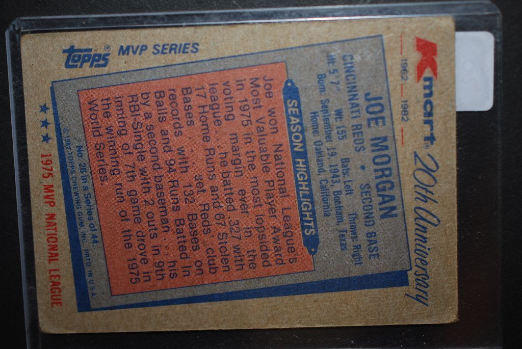 1982 MLB Joe Morgan Cincinnati Reds 20th Anniversary 1975 MVP NL League Baseball Trading Card; EST. $5-10