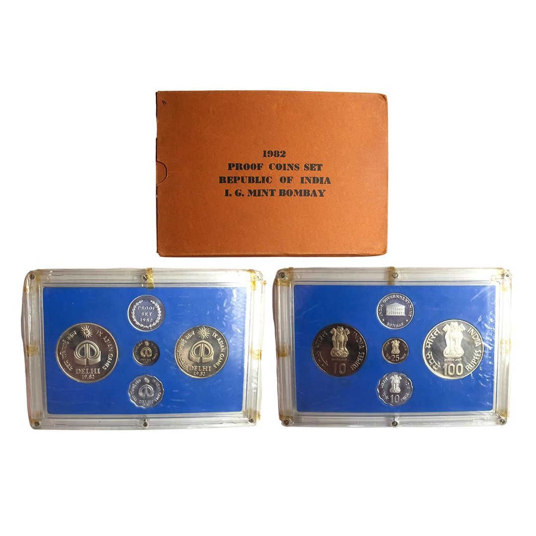 1982, National Integration, Proof set of 4 coins, 100 rupees, 10 rupees, 2 rupees and 50 paise, Bomb