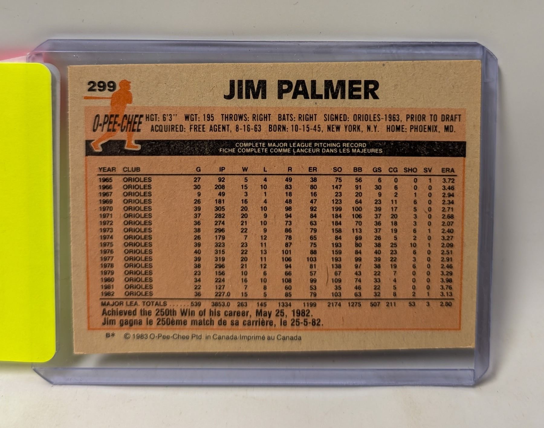 1982 OPC JIM PALMER HOF BASEBALL CARD