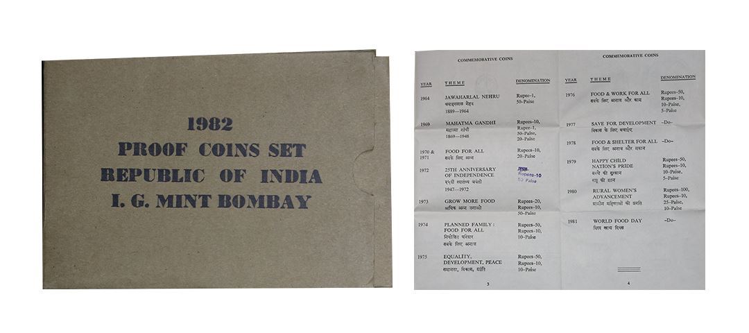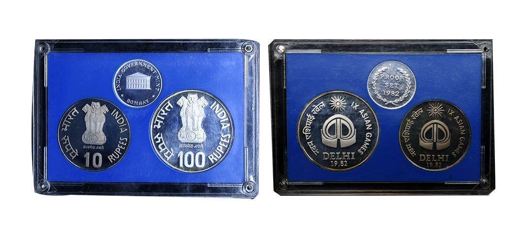 1982 Proof Set, IX Asian Games Delhi, set of 2, Rupees 10 and 100. In near immaculate condition, within original packaging, Very Rare. (2); ( from the collection of Mr. I. K. Kejriwal ).