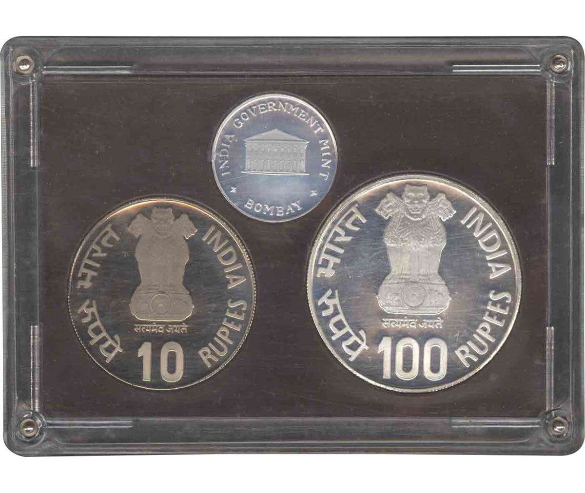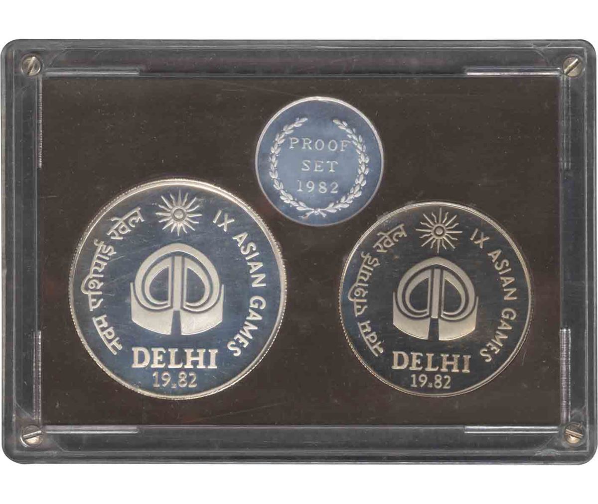 1982, Proof Set, IX Asian Games - Delhi, 100 Rs and 10 Rs,Bombay Mint, (RB # 92),intact condition of the certificate and cover with acrylic case, Rare.