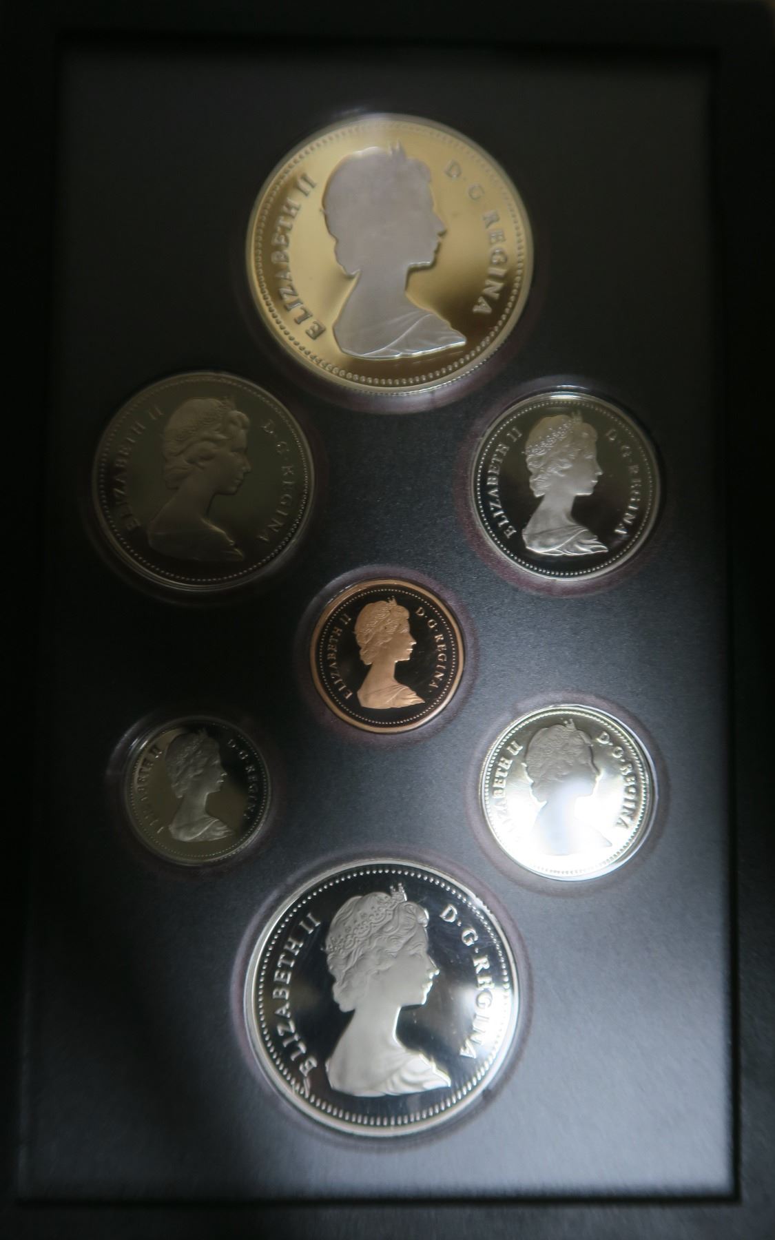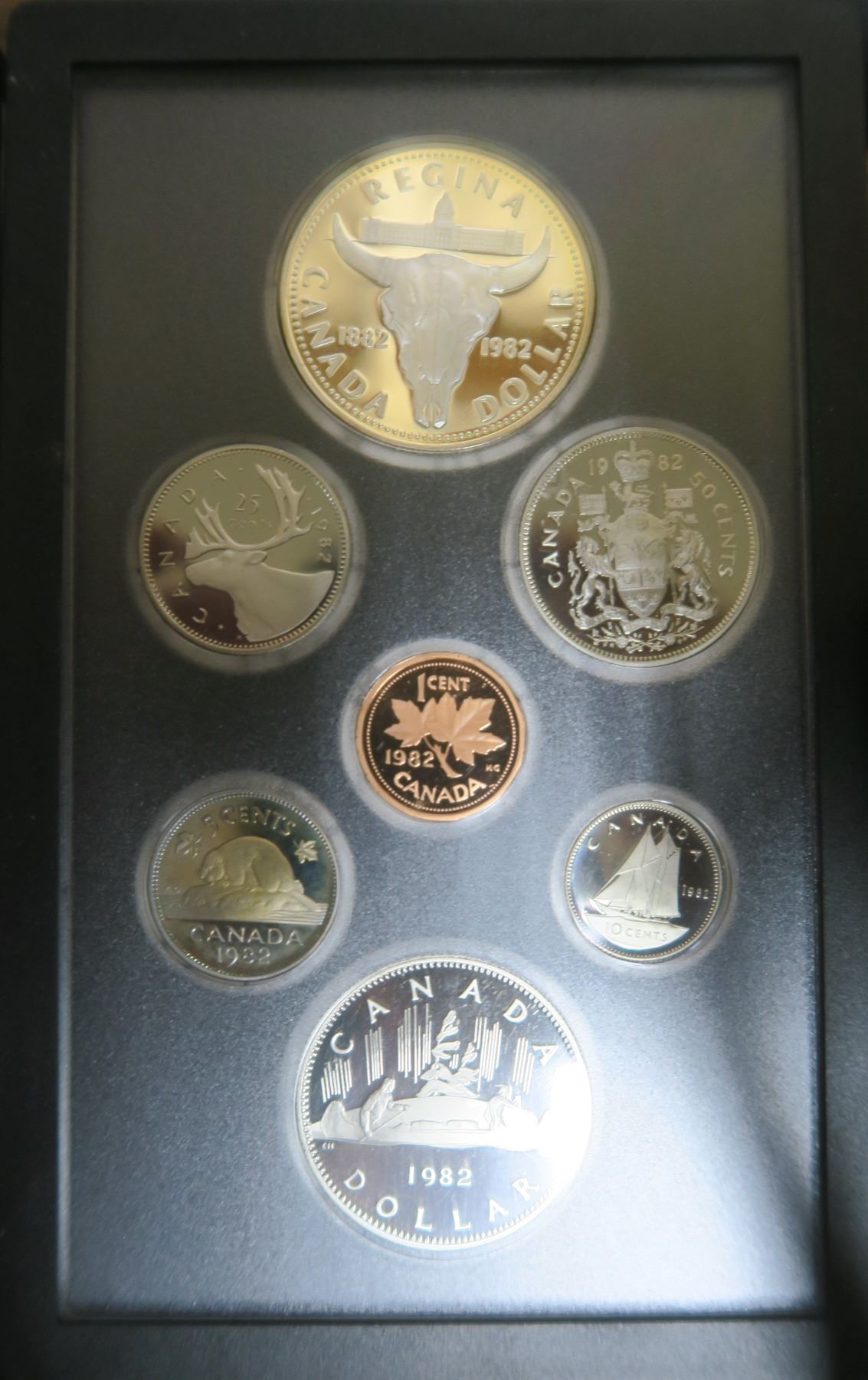 1982 Regina Centennial Proof Set. 7-coin Proof Set includes popular Bison Silver Dollar. All coins have Ultra Heavy Cameos. Housed in its original case of issue.