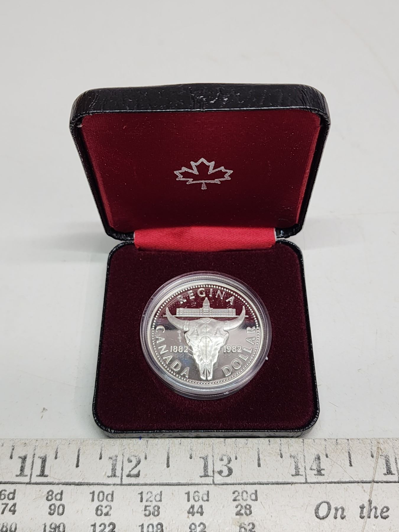 1982 Regina Centennial Silver Dollar. Popular bison skull. Housed in its original case of issue. Proof with Ultra Heavy Cameo. Bright White.