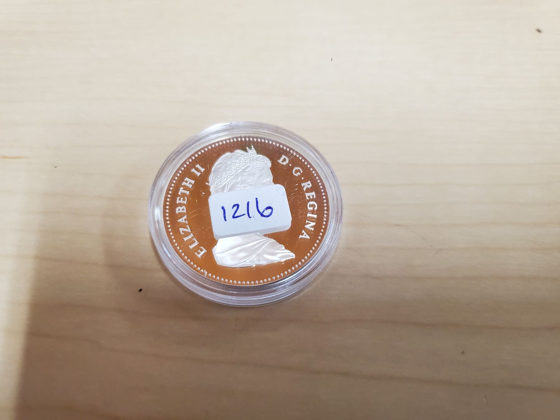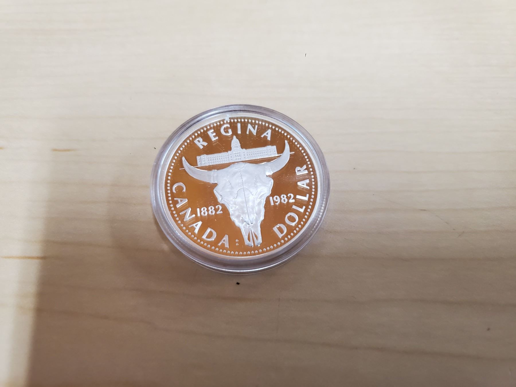 1982 Regina Centennial Silver Dollar. Proof with Ultra Heavy Cameo. Popular bison skull. Housed in its original hard plastic holder.
