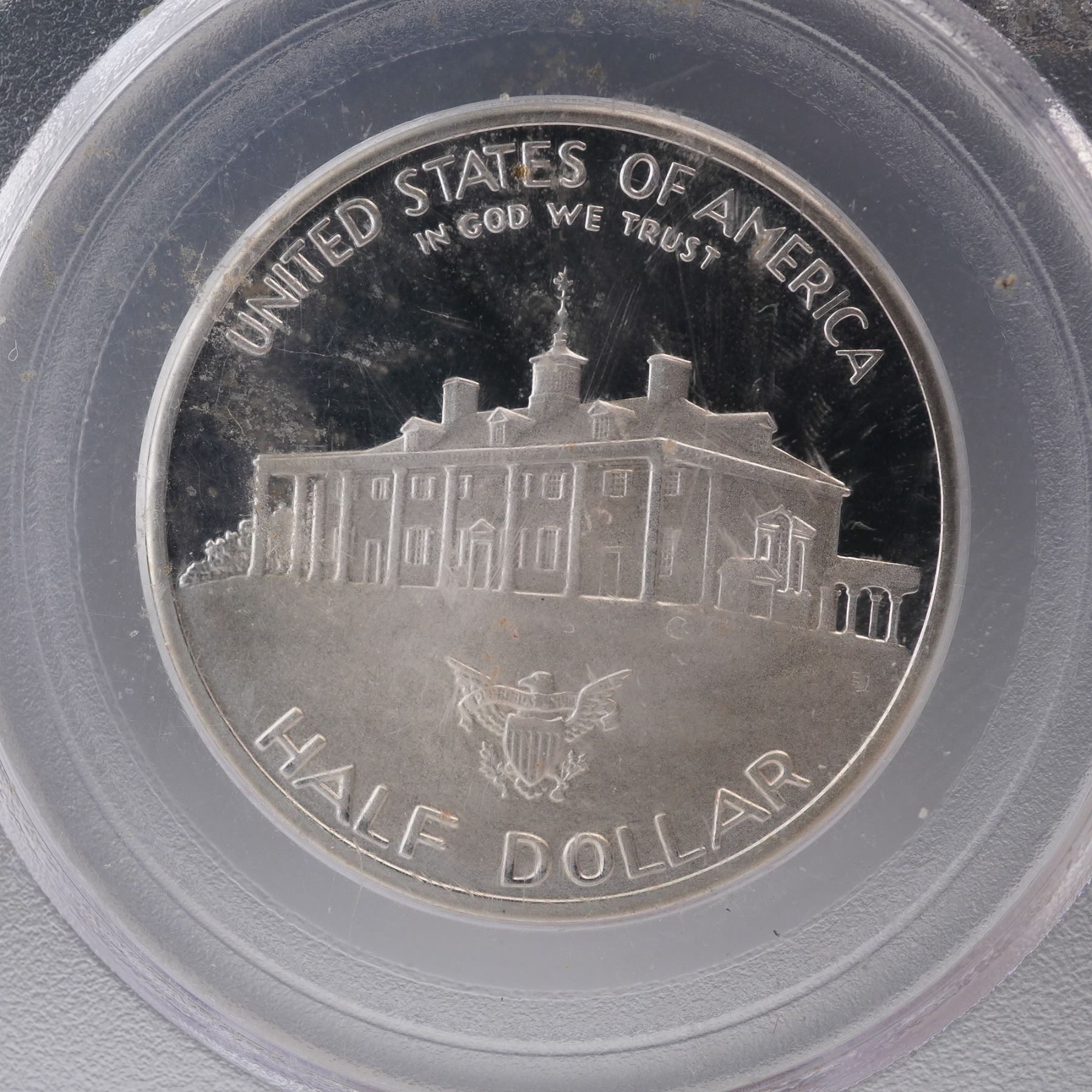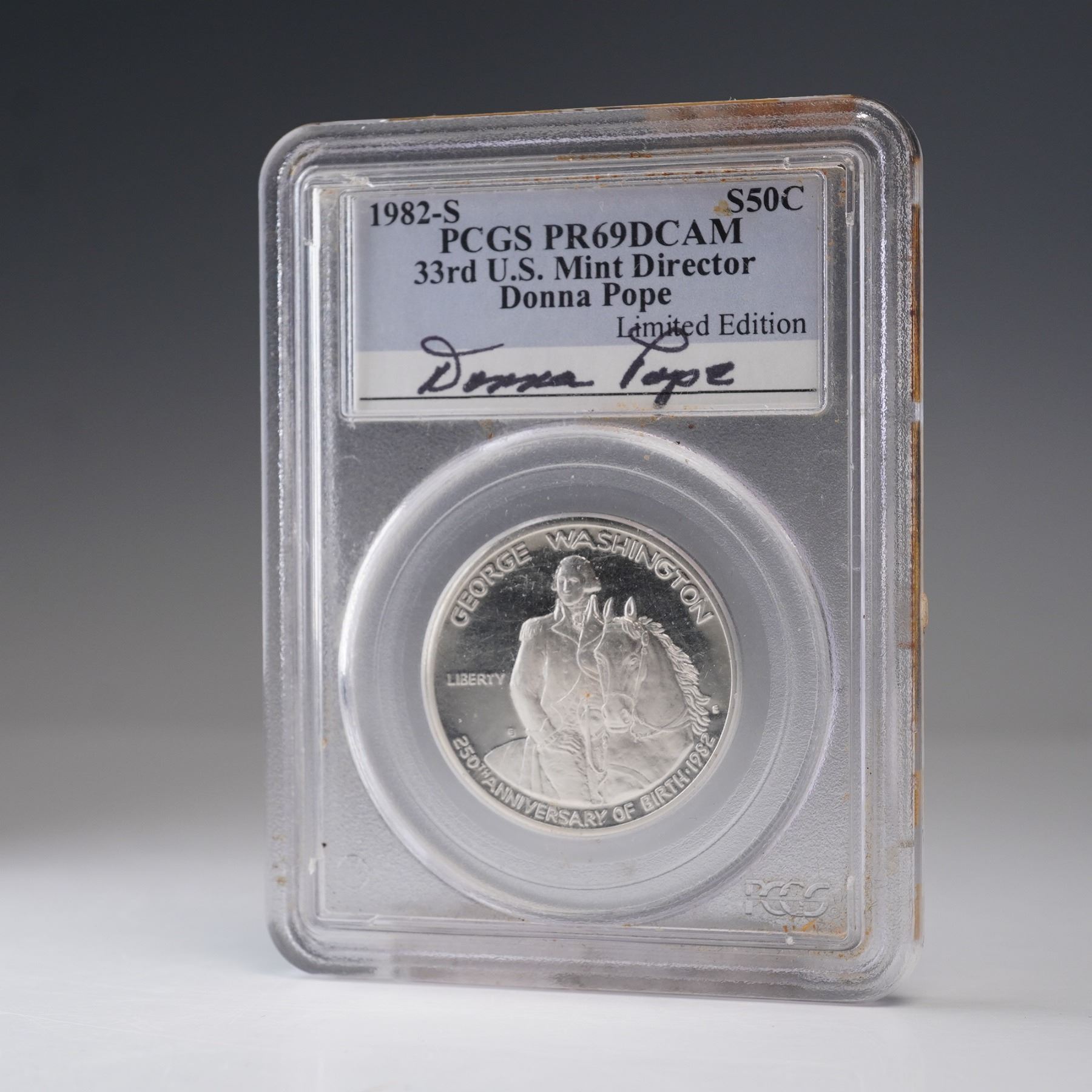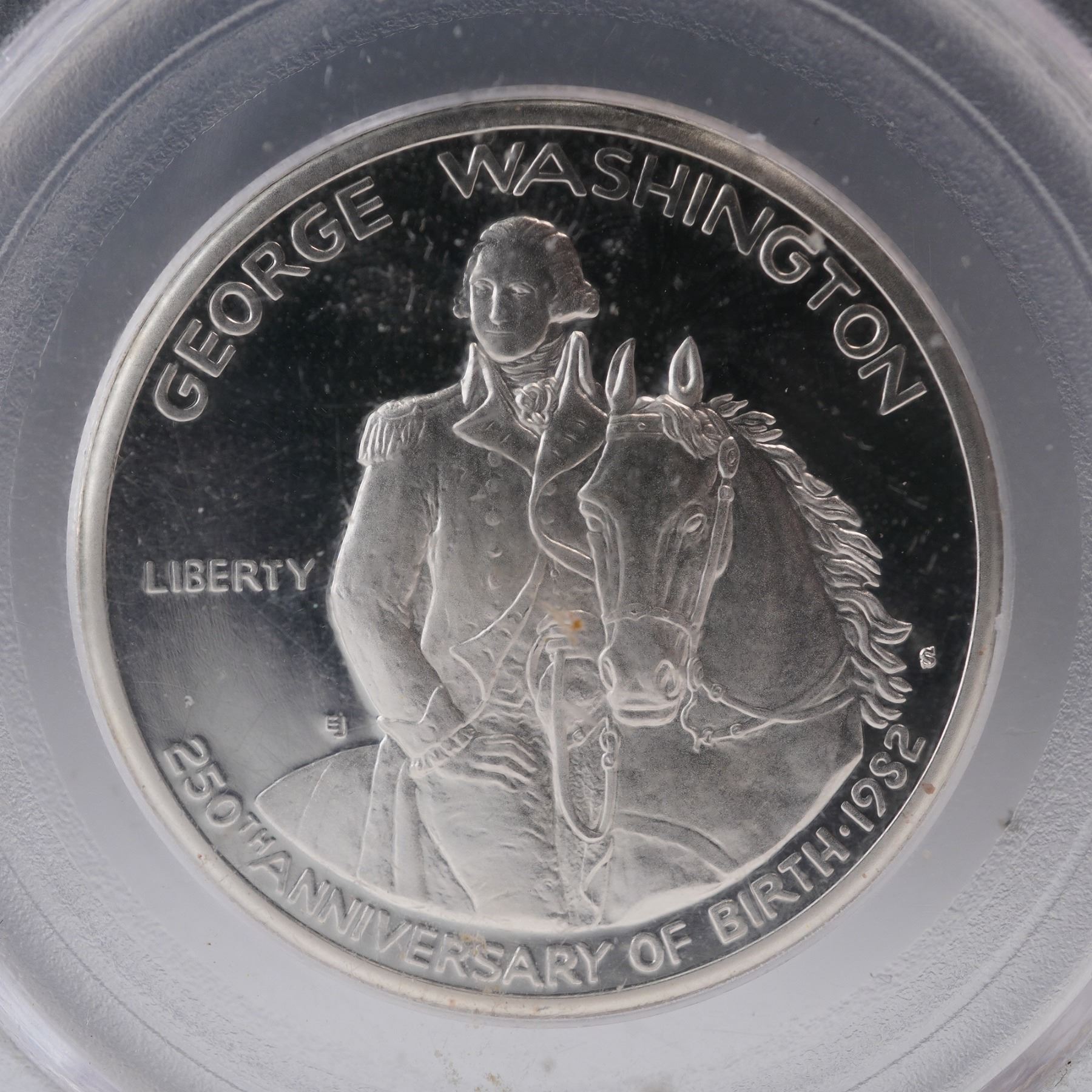 Struck at the San Francisco Mint and certified by PCGS as PR69 Deep Cameo. This 1982-S George Washington Commemorative Half Dollar was issued to honor the 250th anniversary of Washington's birth. The obverse presents an equestrian portrait of the nation's first president in detailed military uniform beside his horse, with inscriptions noting the milestone anniversary. The reverse depicts his Mount Vernon estate, finely engraved with architectural fidelity, accompanied by the national motto and heraldic eagle. The coin's obverse and reverse bears the designers initials "EJ". Housed in a graded PCGS holder for further preservation and authentication. Slab measures: 2.5"L x 0.25"W x 3.25"H. Coin diameter: 30.61 mm.
