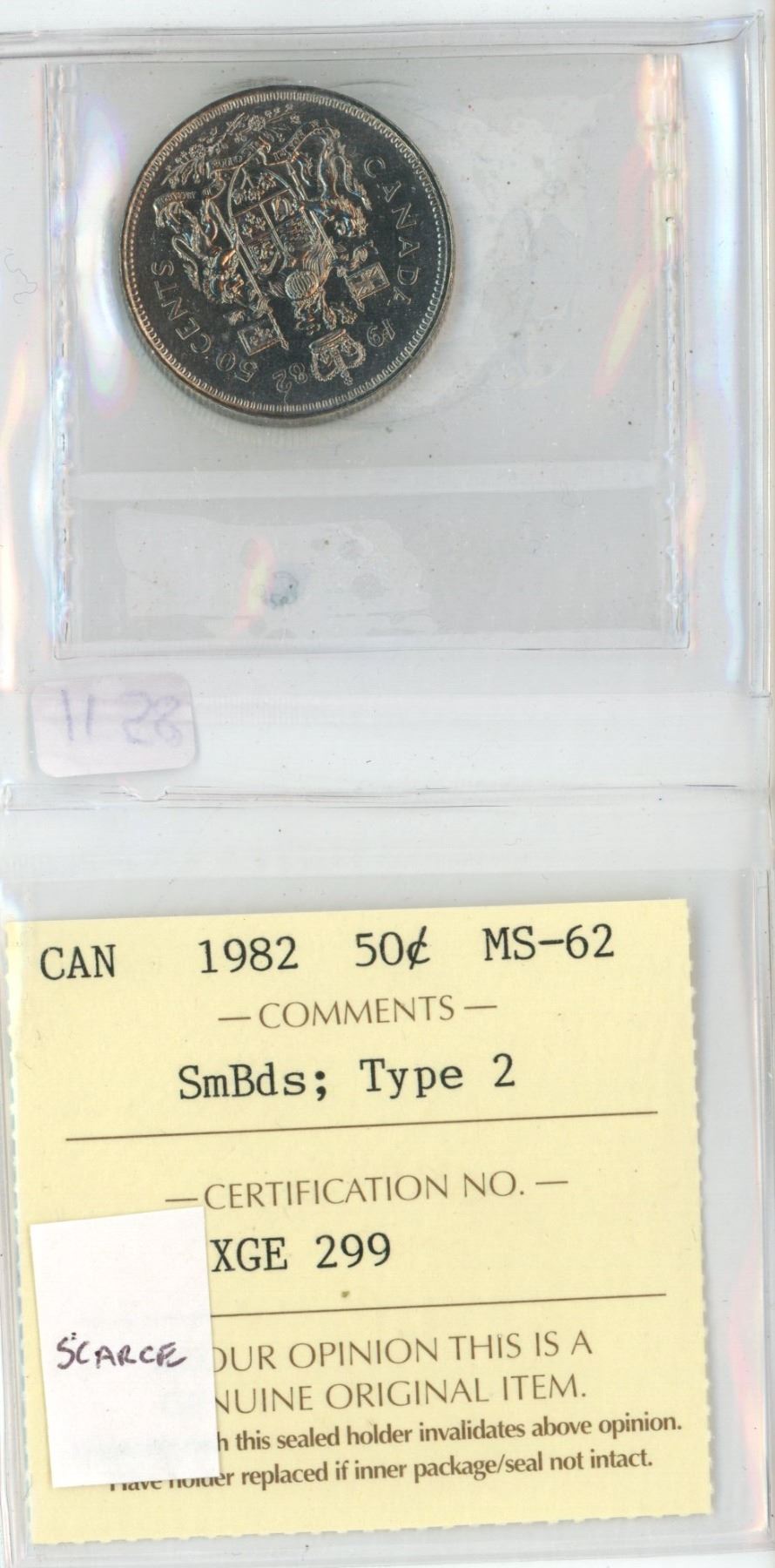 1982 Small Beads, Type 2 Canadian 50 Cents. ICCS certified & graded MS-62. Scarce.
