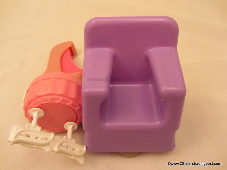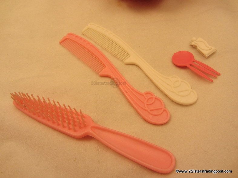 the Twirly Curls Curler, 1 hair comb, 1 hair brush, 2 combs, 1 barrette and the purple salon chair