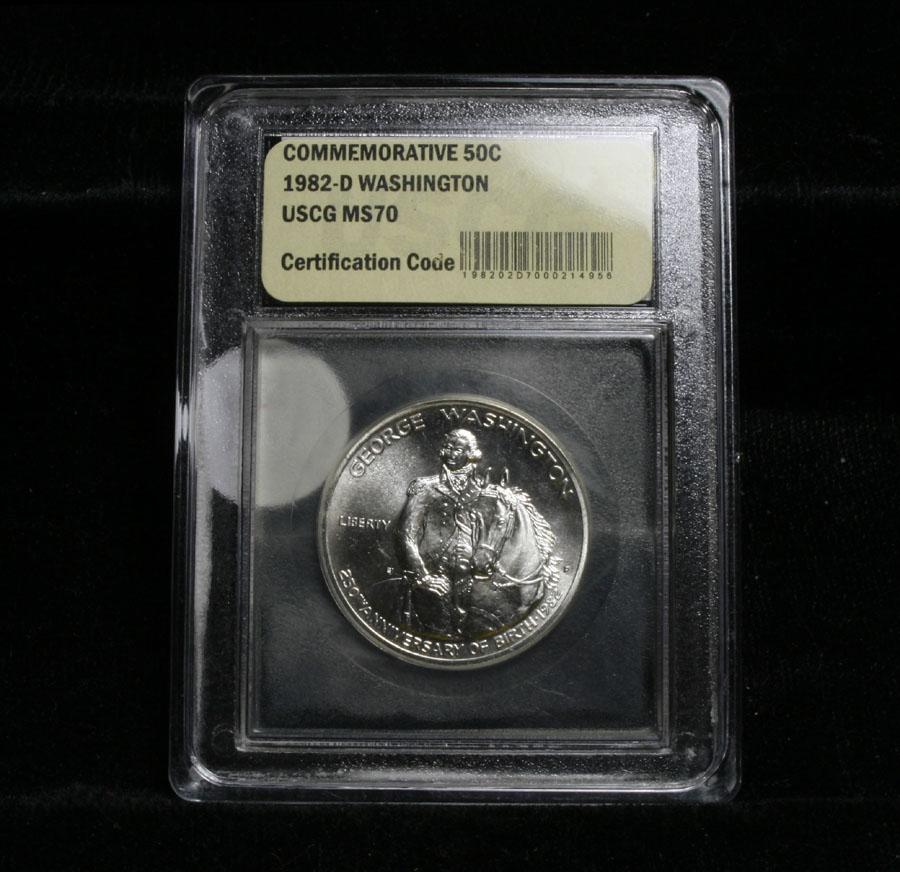 Beautiful Silver Uncirculated Commemorative celebrating the 250th Anniversary of the Birth of Washington. One of only 2 Modern Proof halves to be issued in 90% silver. This and the Bill of rights. The Uncirculated Commemorative Silver half Dollar is Graded ms70 by USCG. . Estimated Value $75