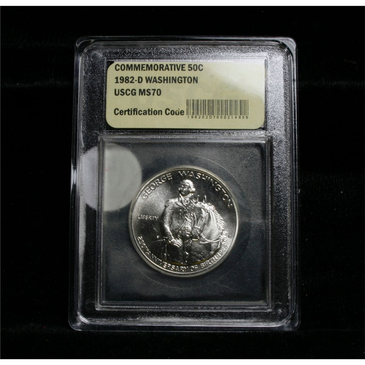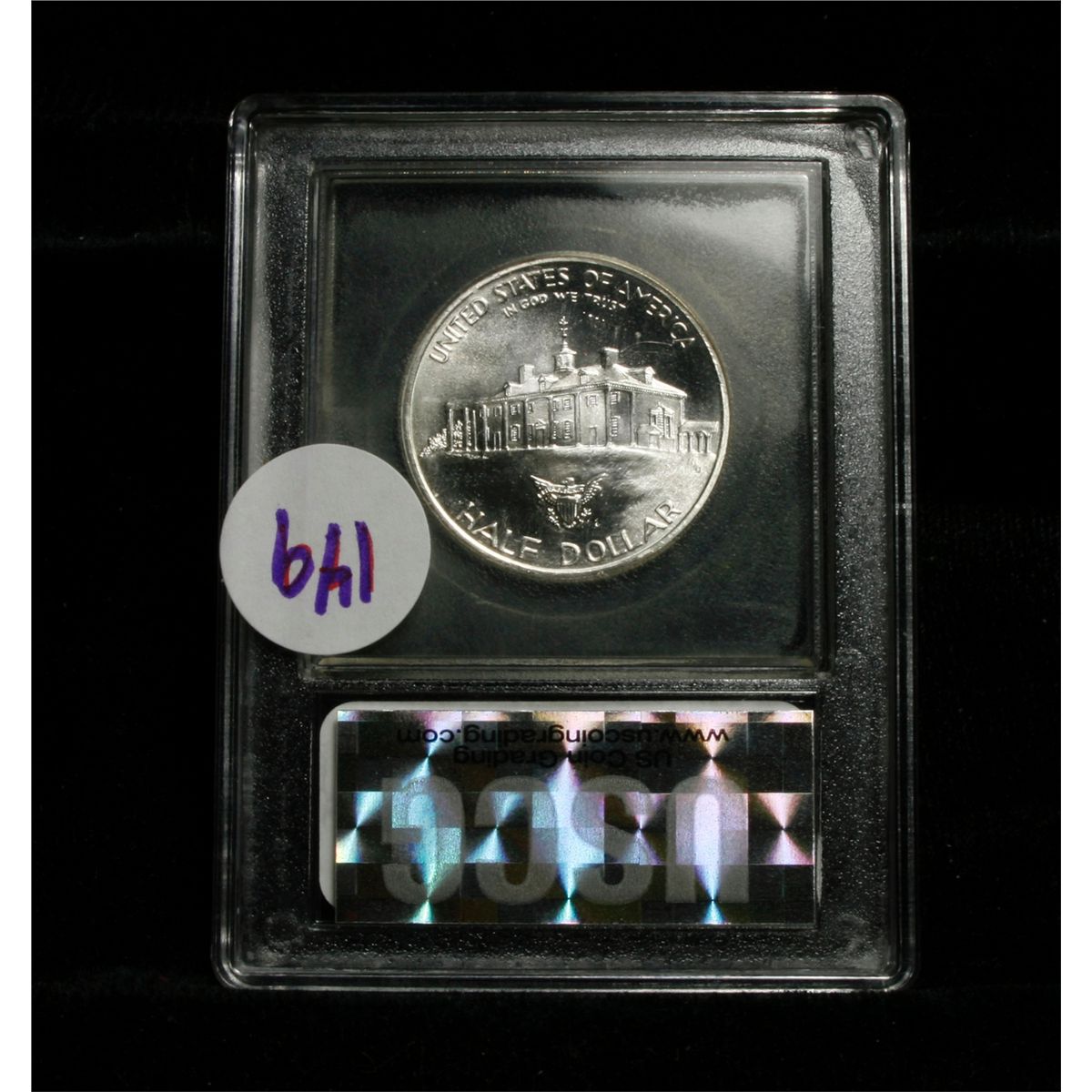 Beautiful Silver Uncirculated Commemorative celebrating the 250th Anniversary of the Birth of Washington. One of only 2 Modern Proof halves to be issued in 90% silver. This and the Bill of rights. The Uncirculated Commemorative Silver half Dollar is Graded ms70 by USCG. . Estimated Value $75