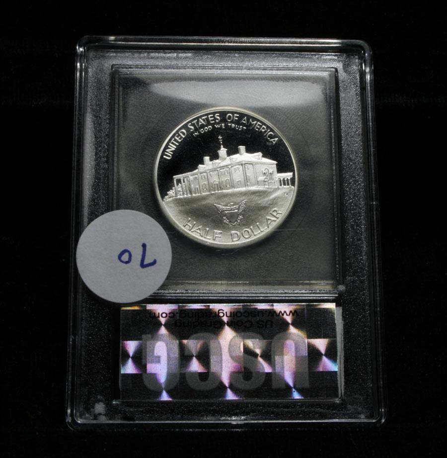 One of only 2 Modern Proof halves to be issued in 90% silver. This and the Bill of rights. Proof Commemorative Silver half Dollar Graded PF70 DCAM by USCG. Beautiful Silver Proof Commemorative celebrating the 250th Anniversary of the Birth of Washington. Estimated Value $75