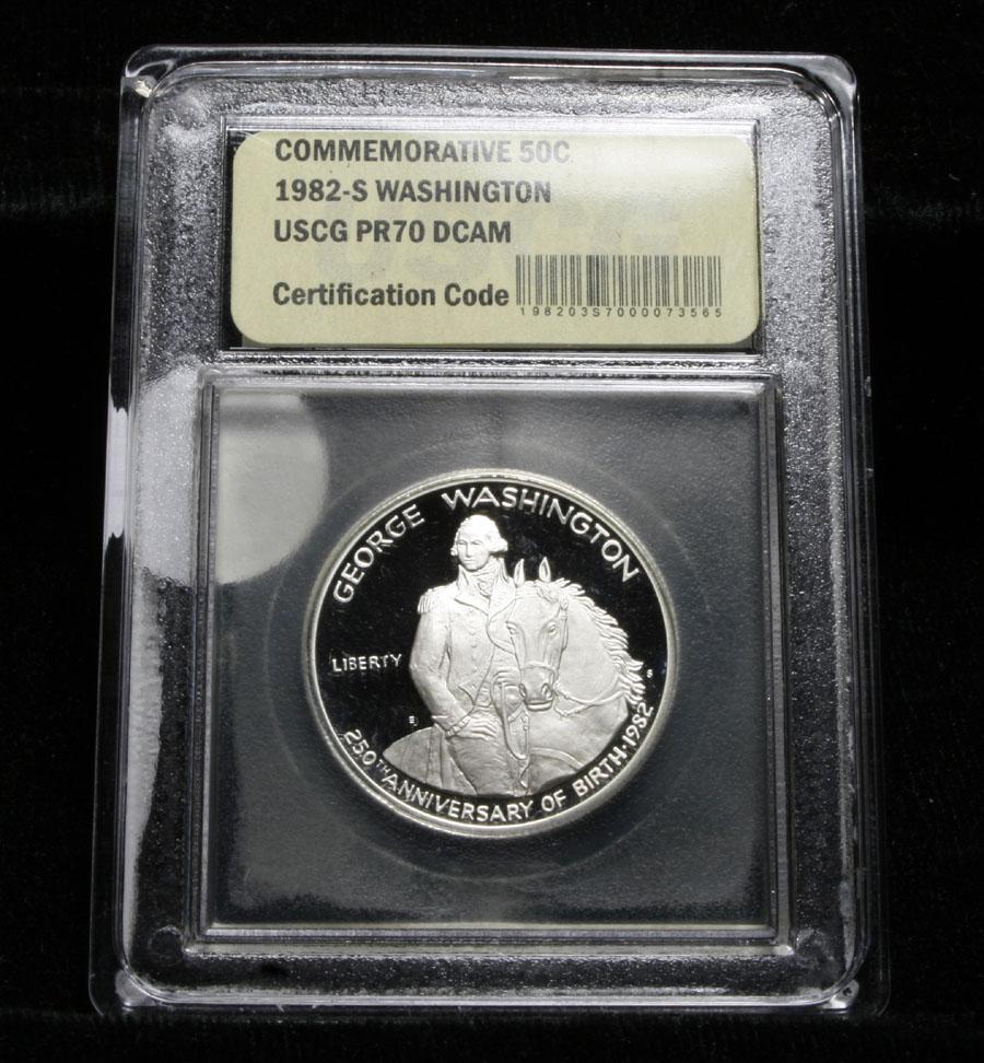 One of only 2 Modern Proof halves to be issued in 90% silver. This and the Bill of rights. Proof Commemorative Silver half Dollar Graded PF70 DCAM by USCG. Beautiful Silver Proof Commemorative celebrating the 250th Anniversary of the Birth of Washington. Estimated Value $75