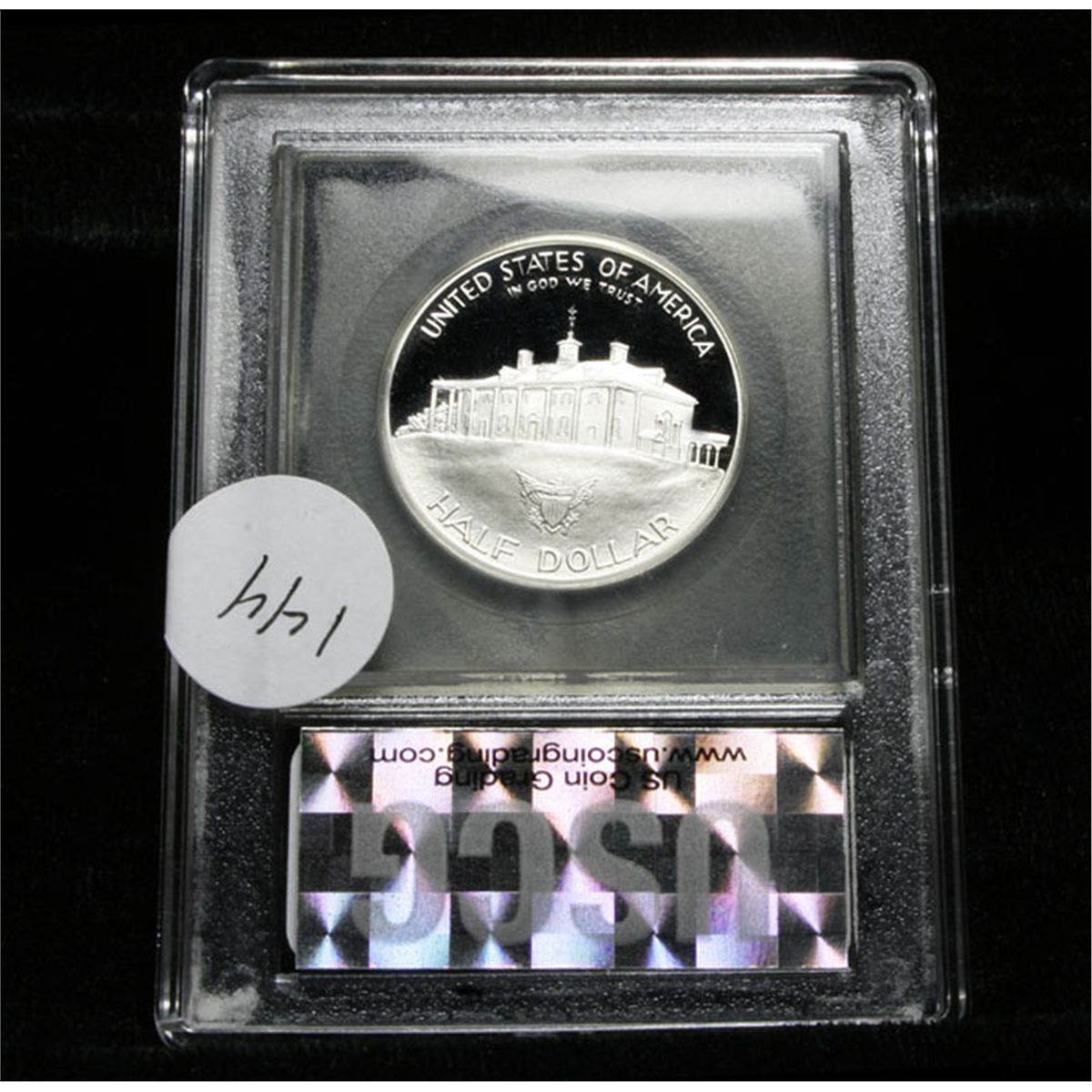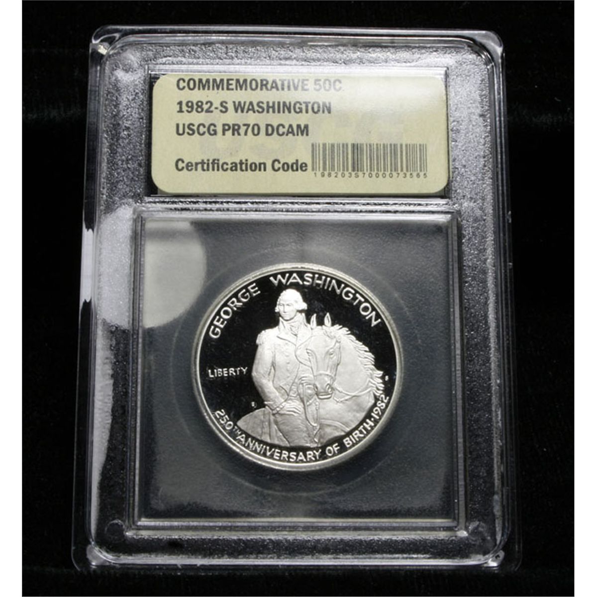 One of only 2 Modern Proof halves to be issued in 90% silver. This and the Bill of rights. Proof Commemorative Silver half Dollar Graded PR70 DCAM by USCG. Beautiful Silver Proof Commemorative celebrating the 250th Anniversary of the Birth of Washington. Estimated Value $75