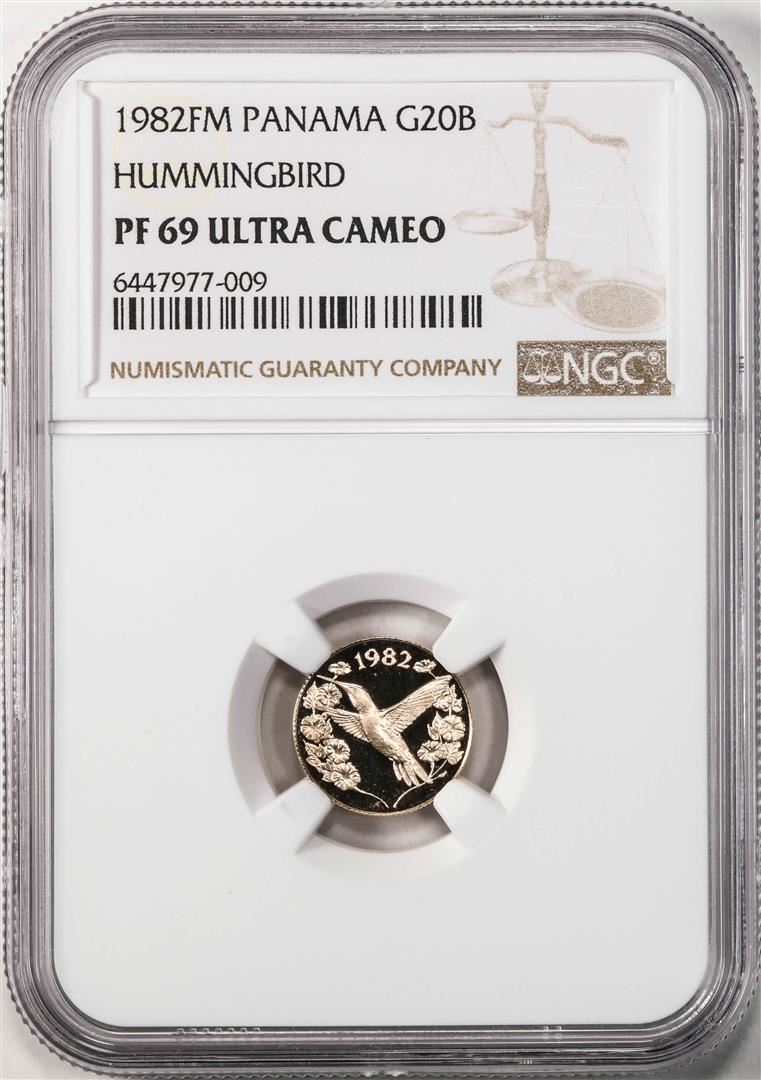 One 1982FM Panama 20 Balboas Proof Hummingbird Gold Coin NGC PF69 Ultra Cameo. NGC Certified.